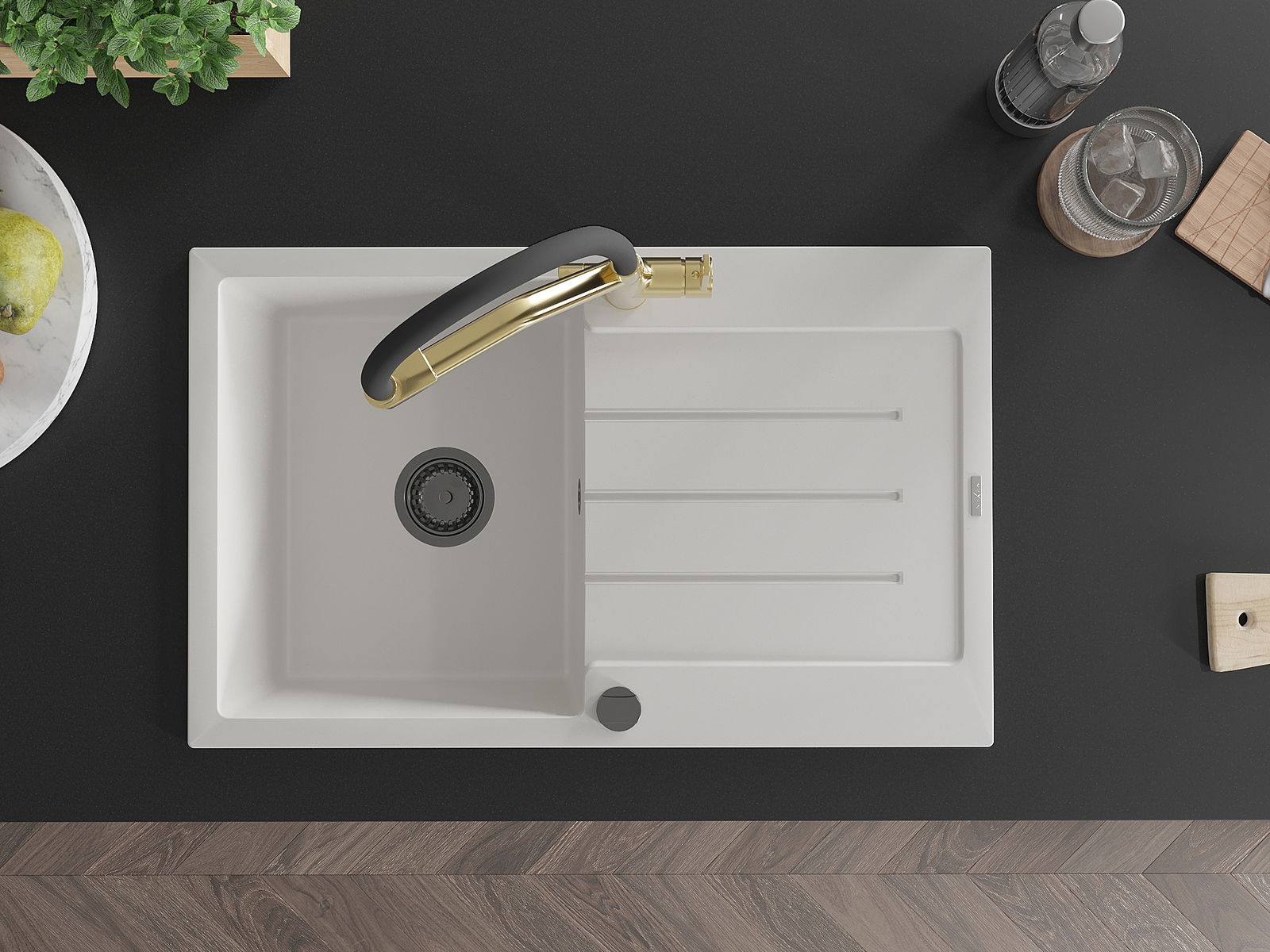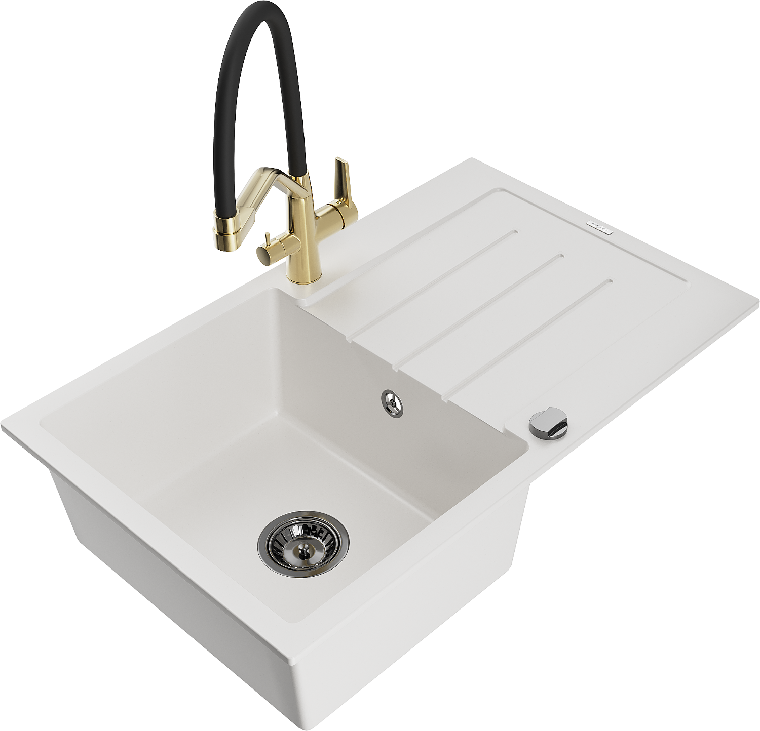Mexen Bruno egykamrás gránit mosogató csepegtetővel és Duo konyhai csapteleppel, fehér - 6513-20-671701-57-B