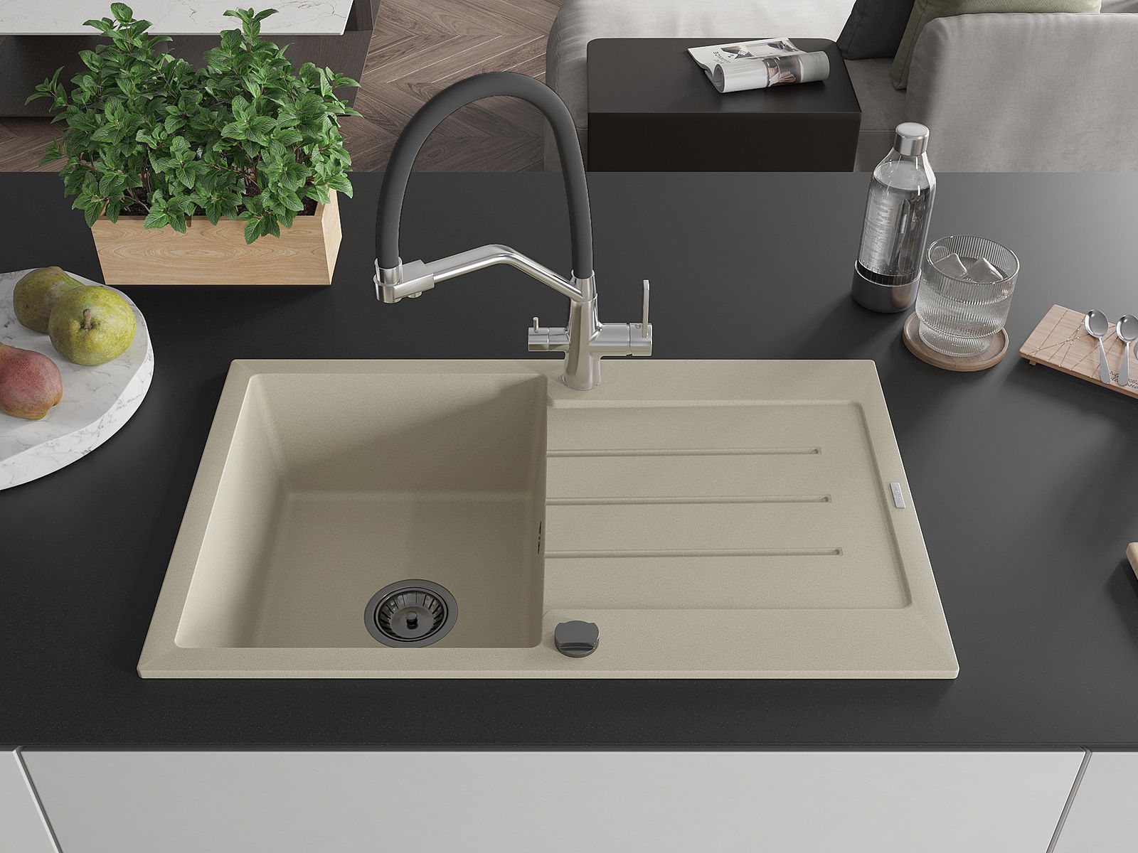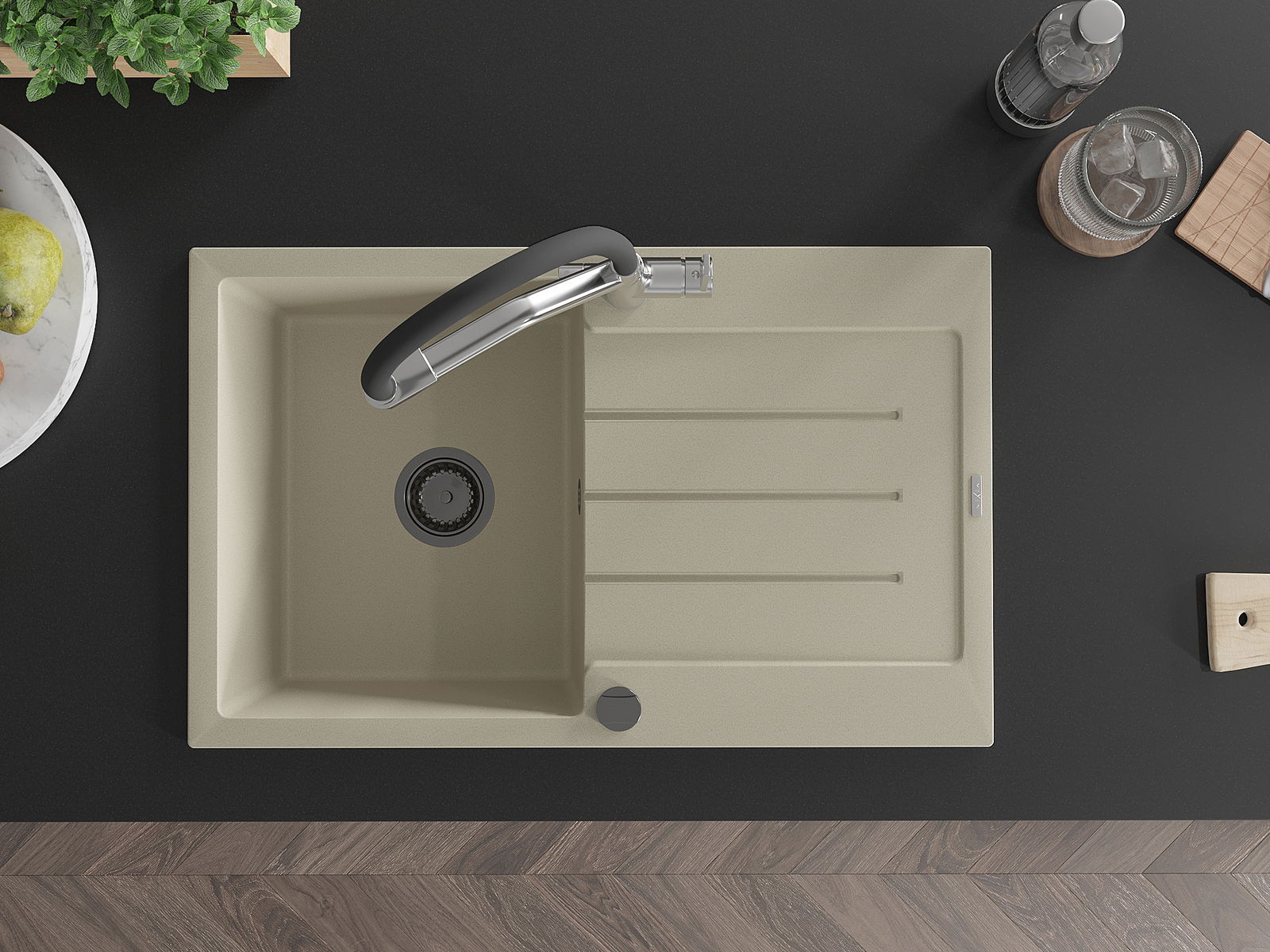 A mosogató kiváló minőségű gránitból készül. Ez egy elegáns és mindenekelőtt minden konyhához praktikus kiegészítés, stílusától függetlenül. A kiváló minőségű és a gránit tartósság biztosítja a sok éves használatát.