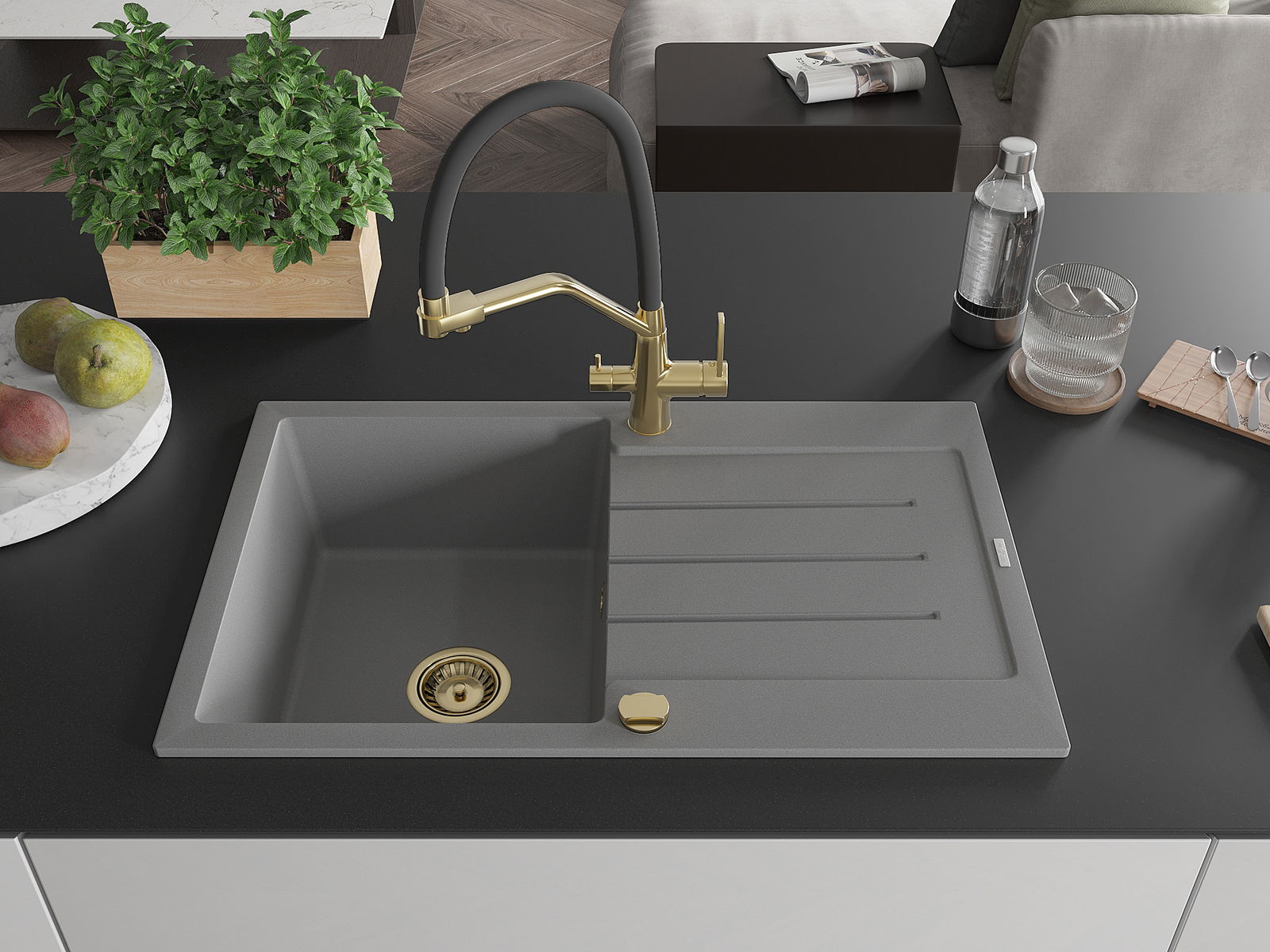 A mosogató kiváló minőségű gránitból készül. Ez egy elegáns és mindenekelőtt minden konyhához praktikus kiegészítés, stílusától függetlenül. A kiváló minőségű és a gránit tartósság biztosítja a sok éves használatát.