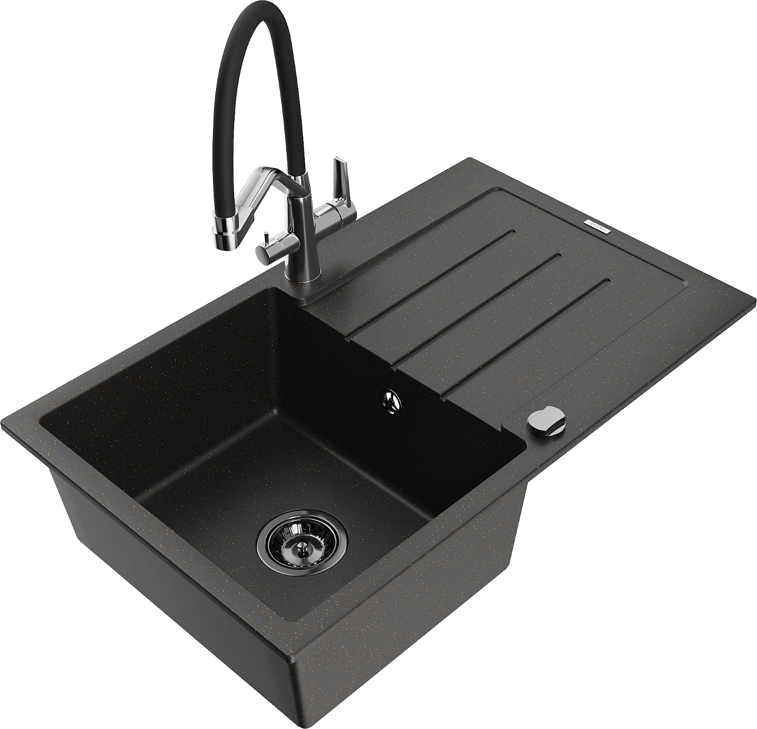 Mexen Bruno 1-medencés gránit mosogató lefolyóval és Duo konyhai csapteleppel, fekete/arany metál - 6513-75-671701-07-B