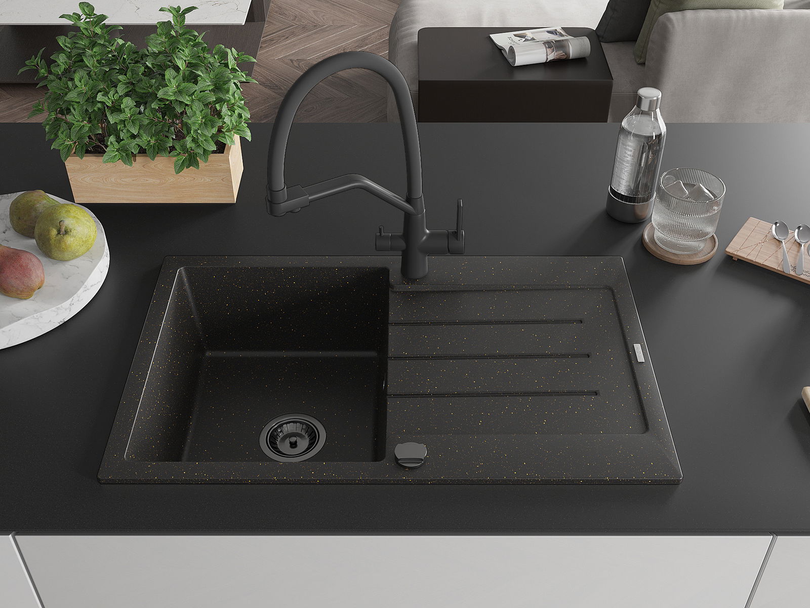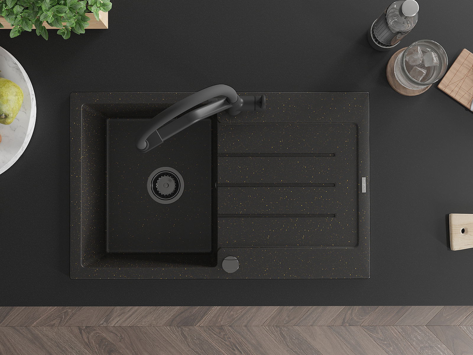Mexen Bruno gránit mosogató 1 medencés csepegtetővel és Duo konyhai csapteleppel, fekete/arany metál - 6513-75-671701-70-B