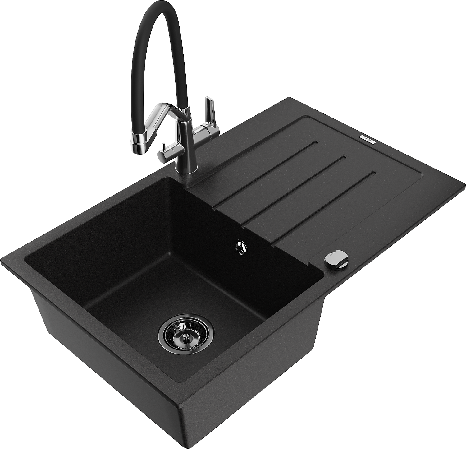 Mexen Bruno gránit mosogató 1-medencével, csepegtetővel és Duo konyhai csappal, fekete - 6513-77-671701-07-B