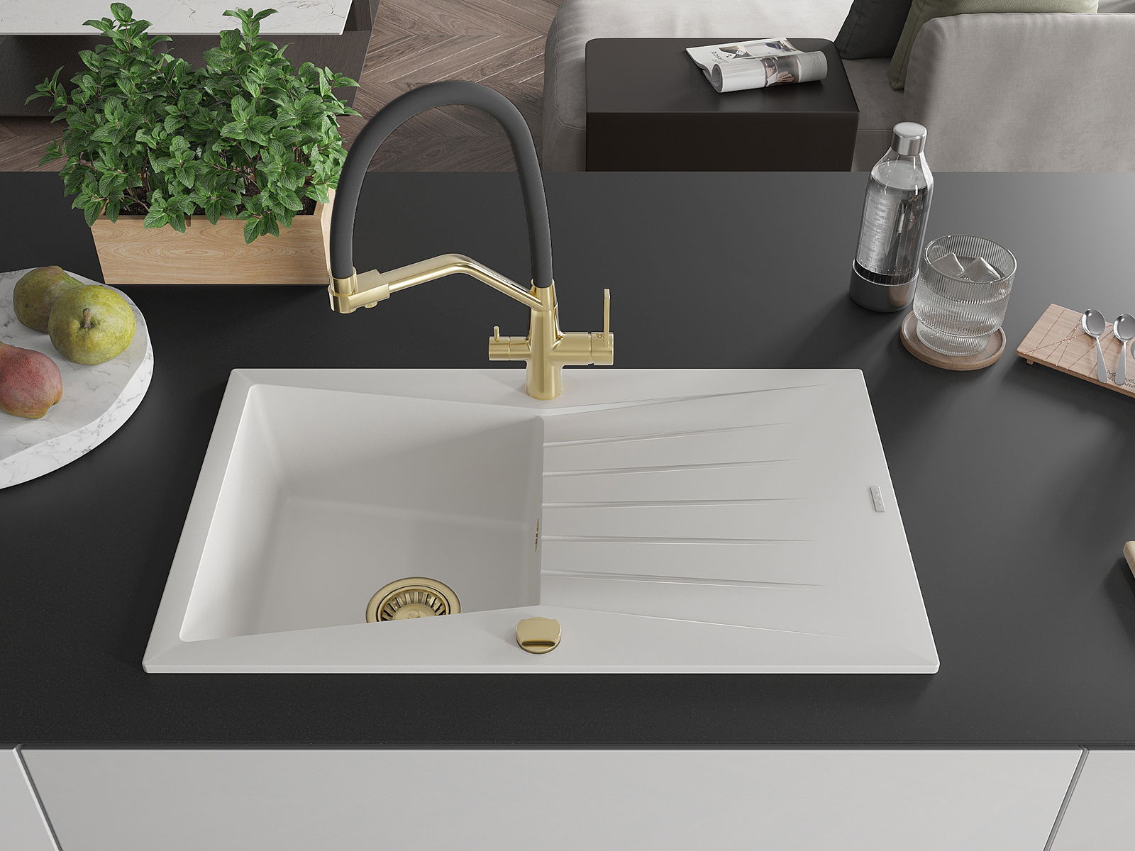 A mosogató magas minőségű gránitból készült. Elegáns, de mindenekelőtt praktikus kiegészítője minden konyhának, függetlenül annak stílusától. A gránit magas minősége és tartóssága hosszú távú használatot biztosít.