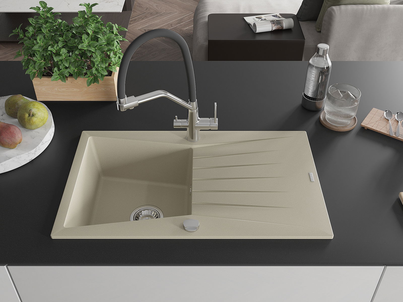 A mosogató magas minőségű gránitból készült. Elegáns, de mindenekelőtt praktikus kiegészítője minden konyhának, függetlenül annak stílusától. A gránit magas minősége és tartóssága hosszú távú használatot biztosít.