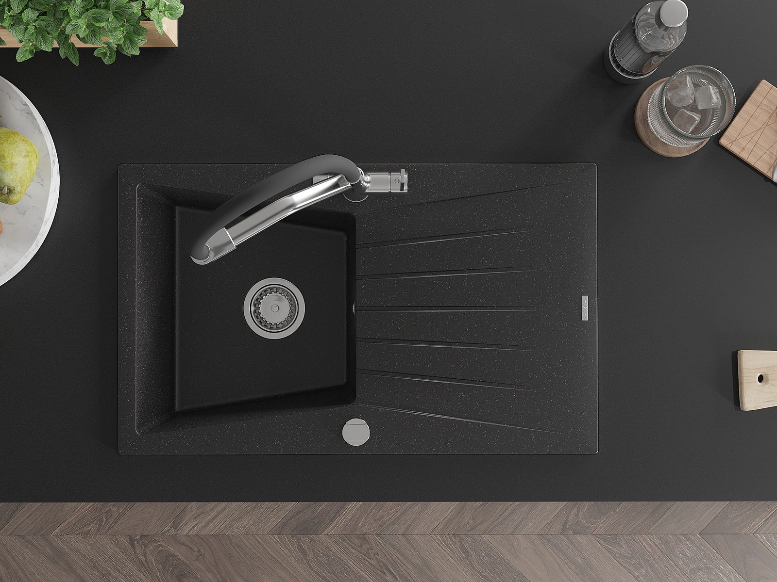 A mosogató magas minőségű gránitból készült. Elegáns, de mindenekelőtt praktikus kiegészítője minden konyhának, függetlenül annak stílusától. A gránit magas minősége és tartóssága hosszú távú használatot biztosít.