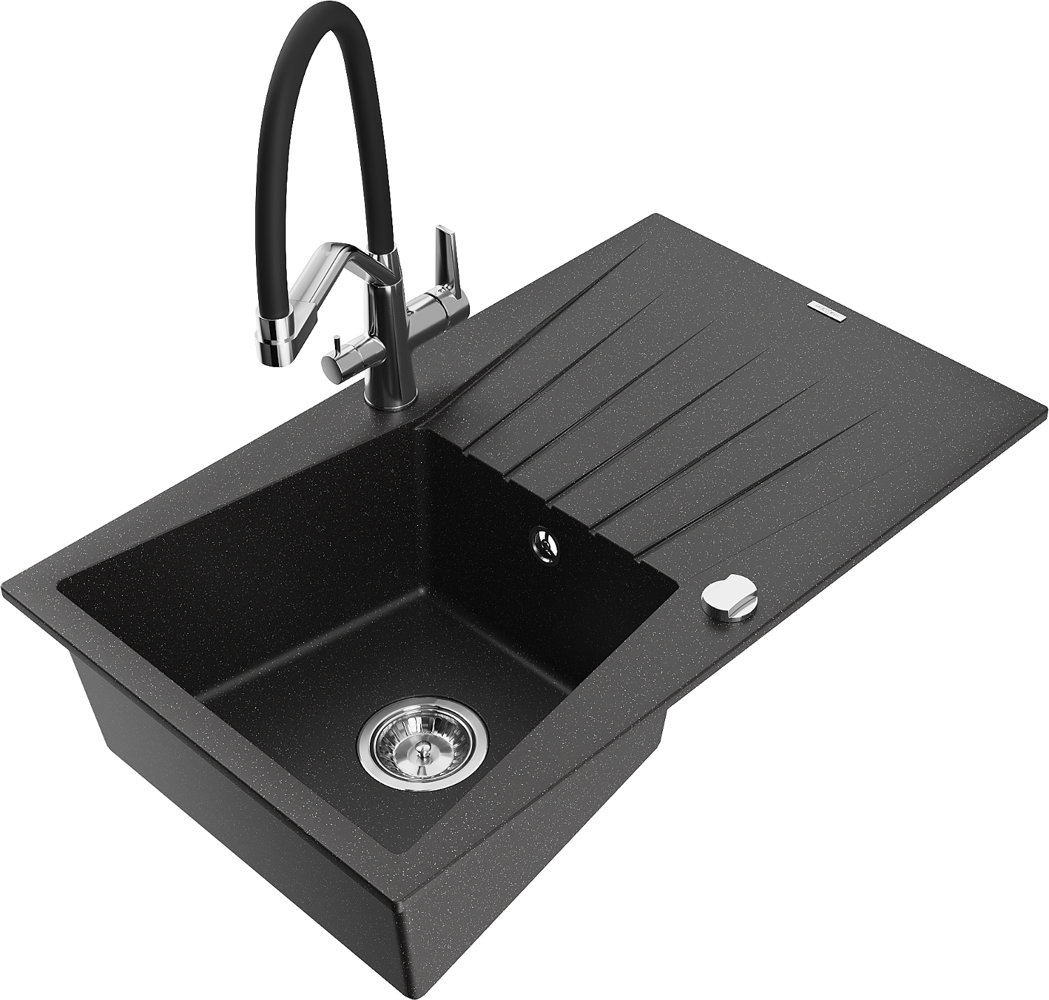 Mexen Cesar gránit mosogató egykamrás csepegtetővel és Duo konyhai csapteleppel, fekete/ezüst metál - 6514-73-671701-07