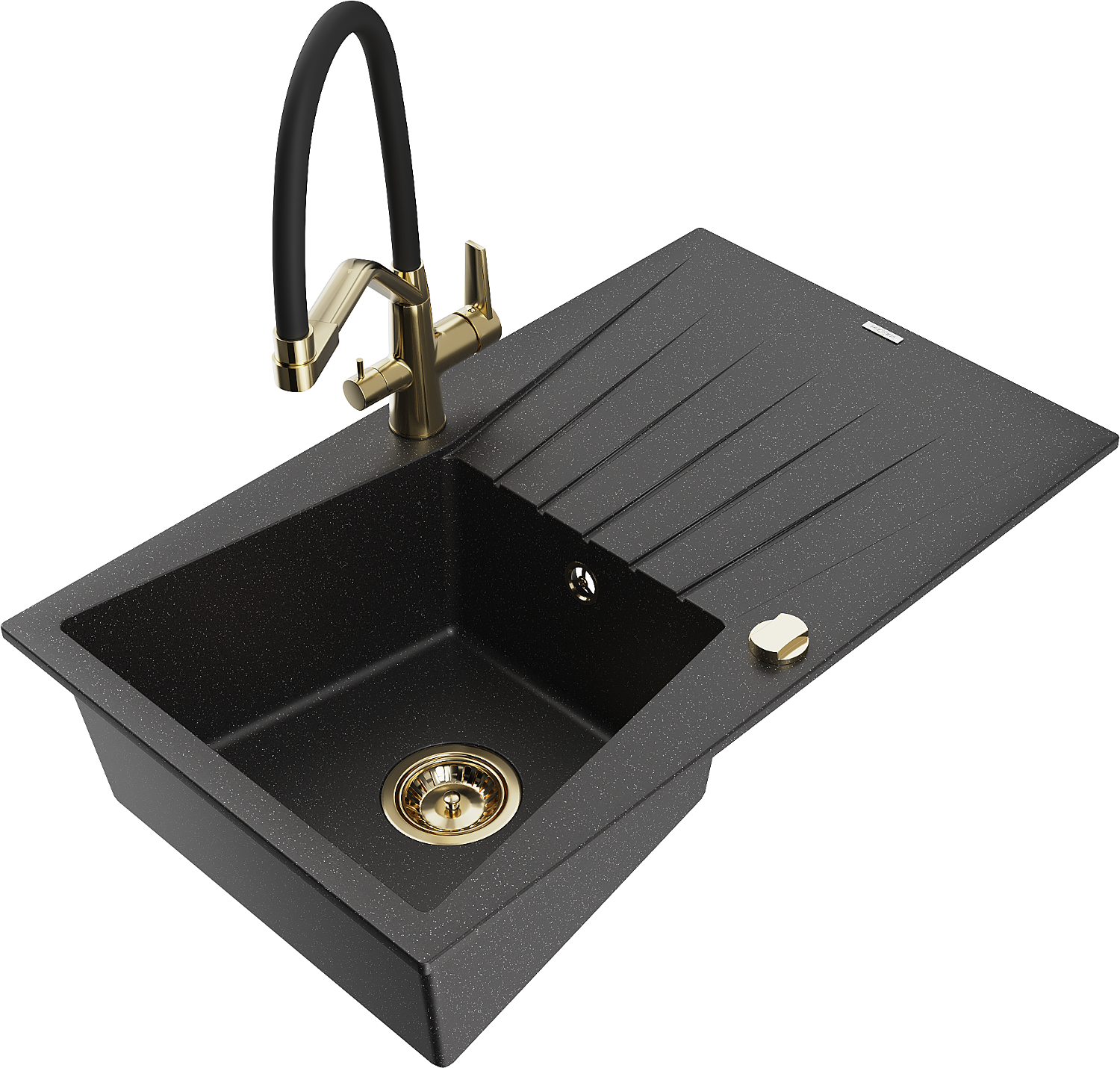 Mexen Cesar egymedencés gránit mosogató csepptálcával és Duo konyhai csapteleppel, fekete/ezüst metál - 6514-73-671701-57-G