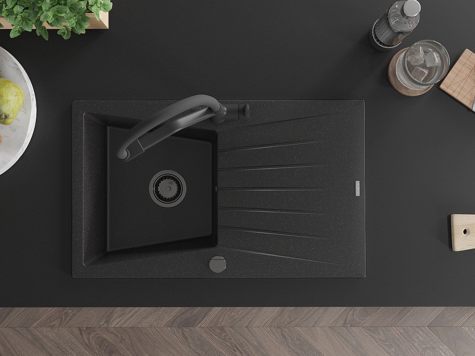 Mexen Cesar 1-medencés gránit mosogató lefolyóval és Duo konyhai csapteleppel, fekete/ezüst metál - 6514-73-671701-70-B