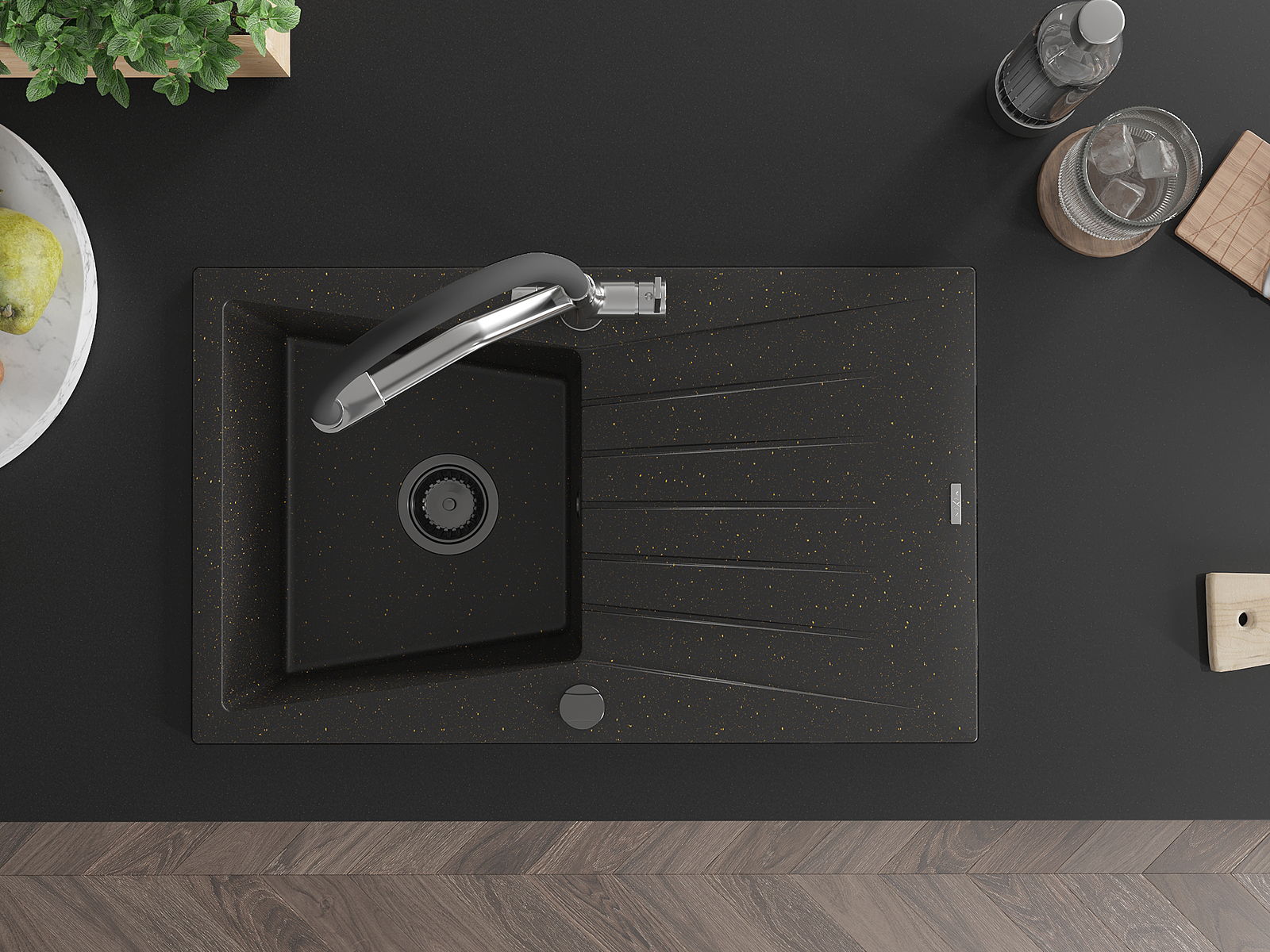 Mexen Cesar egykamrás gránit mosogató csepegtetővel és Duo konyhai csapteleppel, fekete/arany metál - 6514-75-671701-07-B