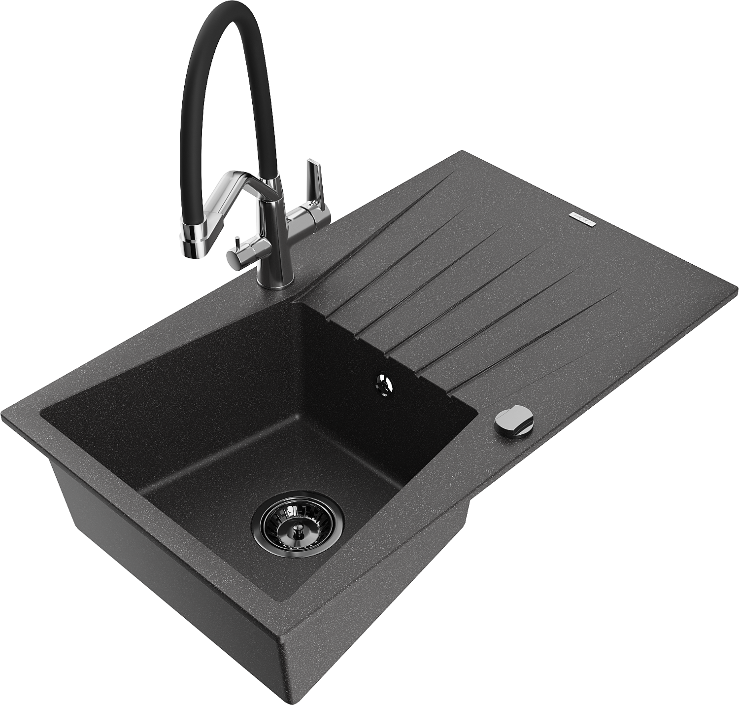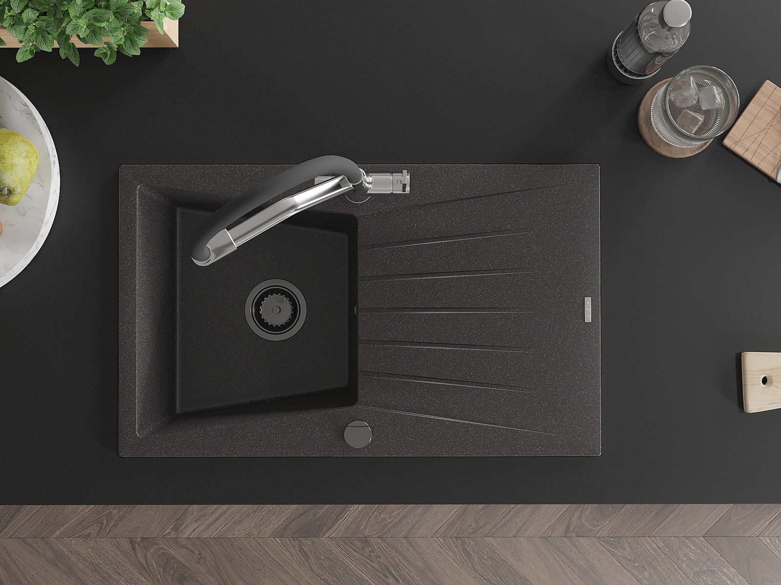 Mexen Cesar gránit mosogató 1-medencés csepegtetővel és Duo konyhai csapteleppel, fekete pöttyözött - 6514-76-671701-07-B