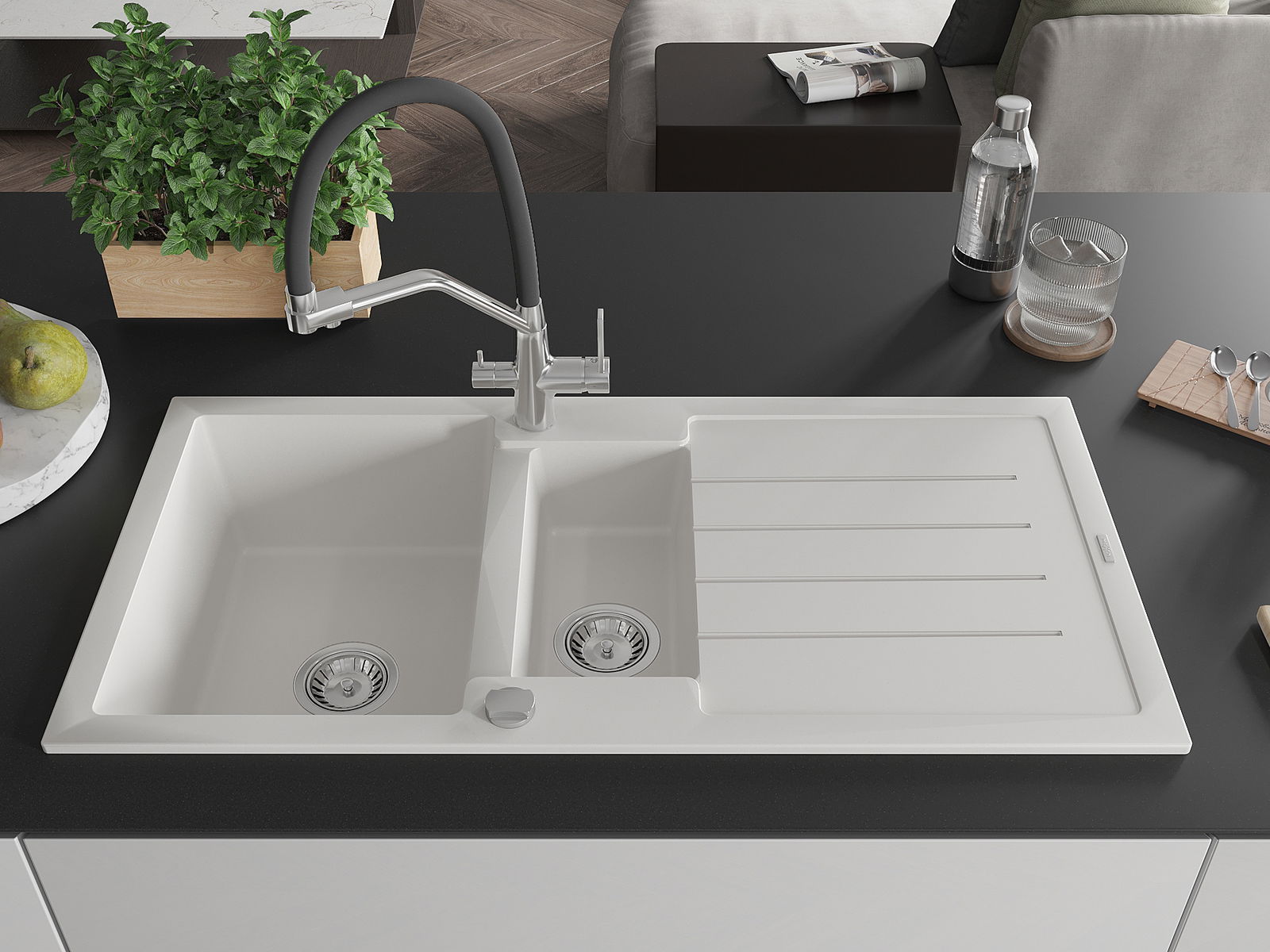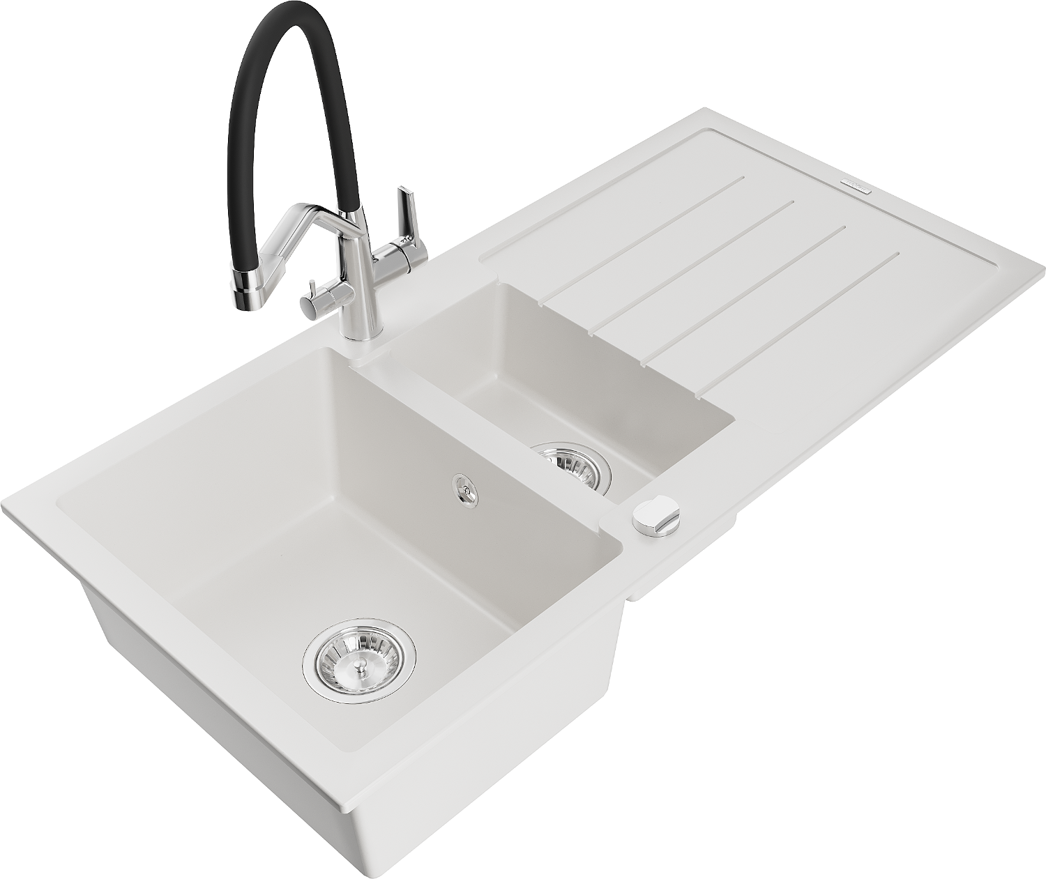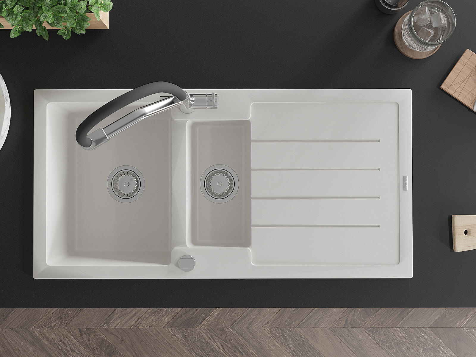 Mexen Andres gránit mosogató 1,5-medencés csepegtetővel és Duo konyhai csapteleppel, fehér - 6515-20-671701-07