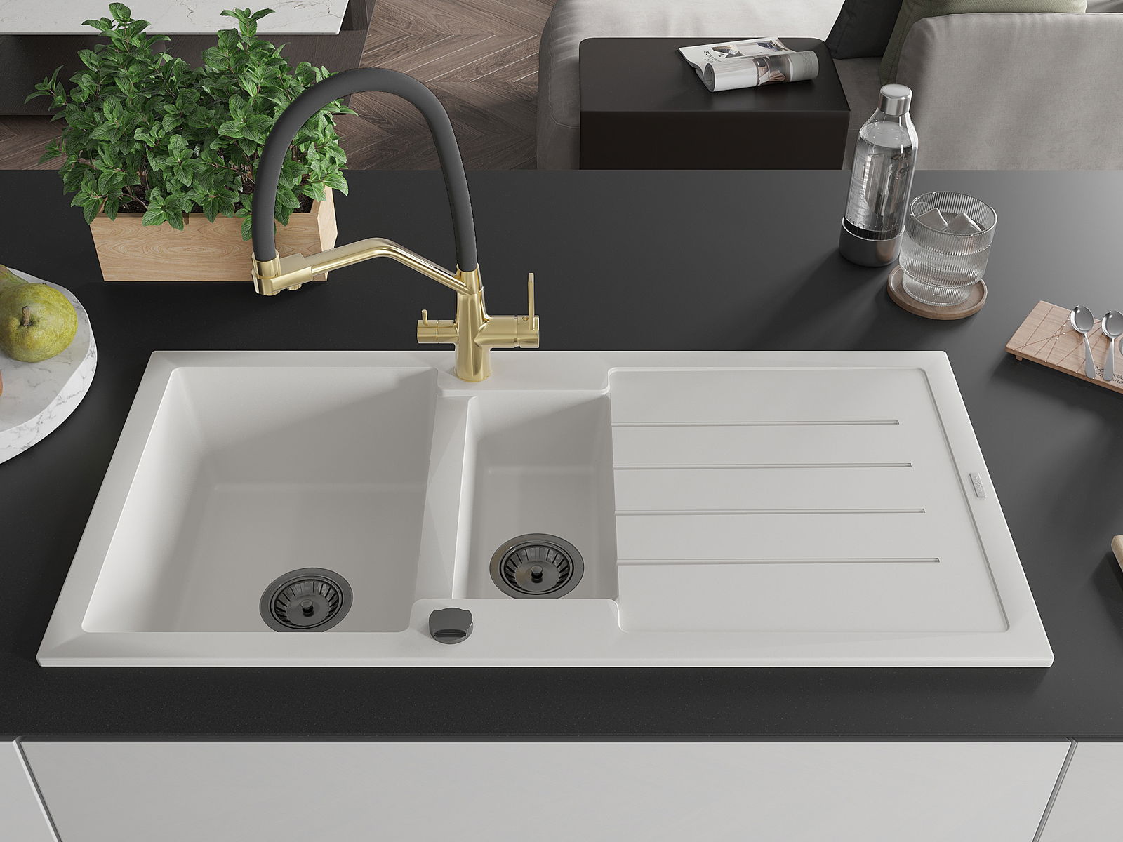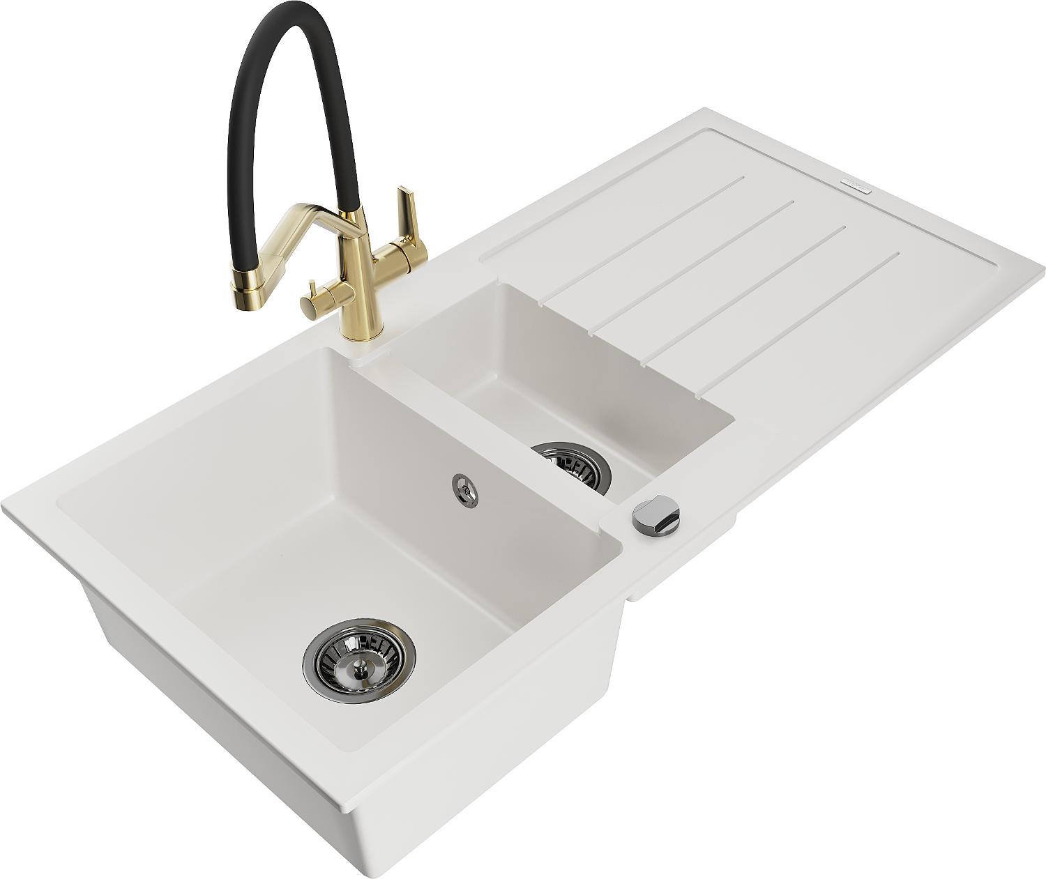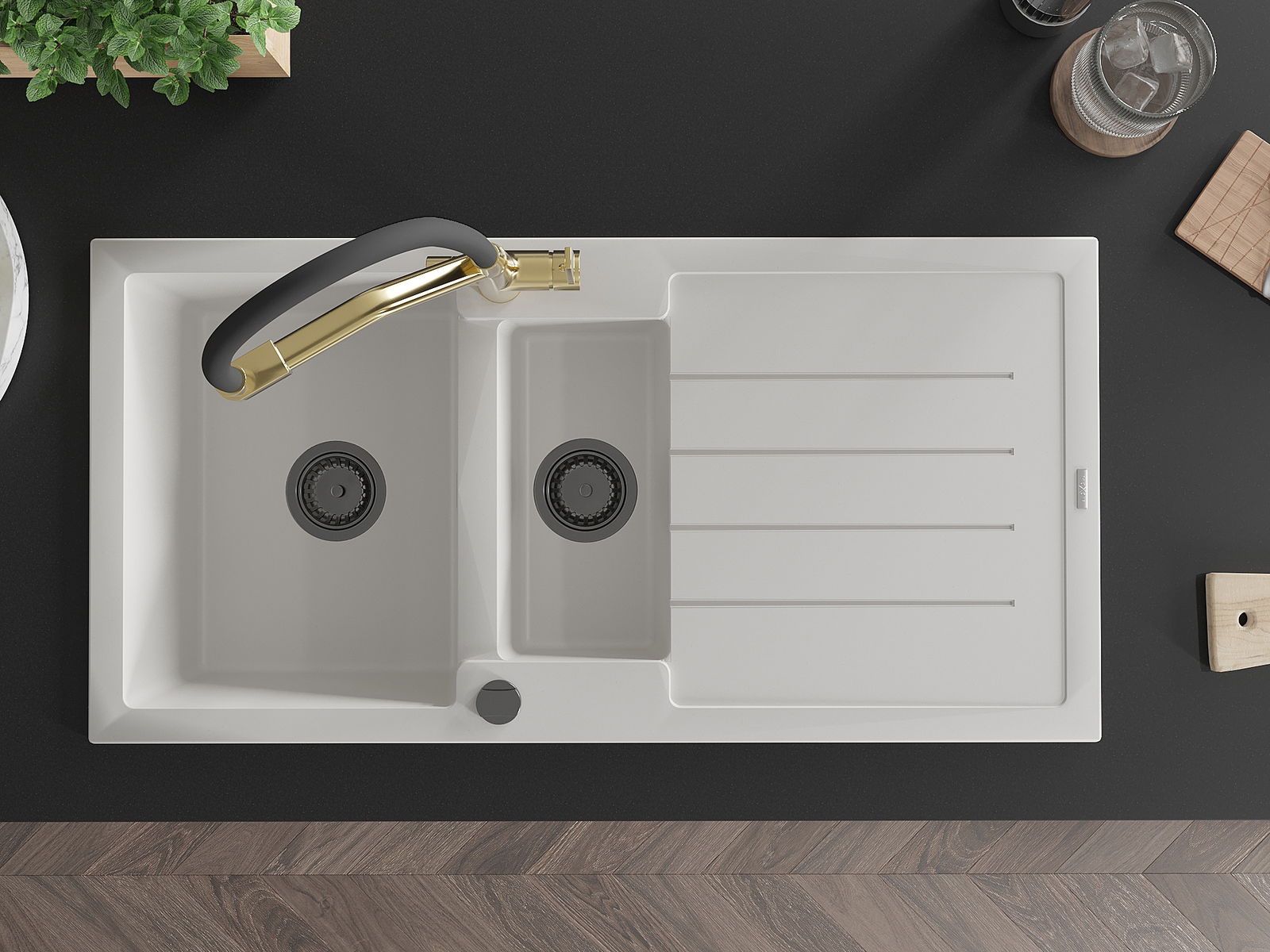 Mexen Andres gránit mosogató 1,5 rekeszes csepegtetővel és Duo konyhai csapteleppel, fehér - 6515-20-671701-57-B