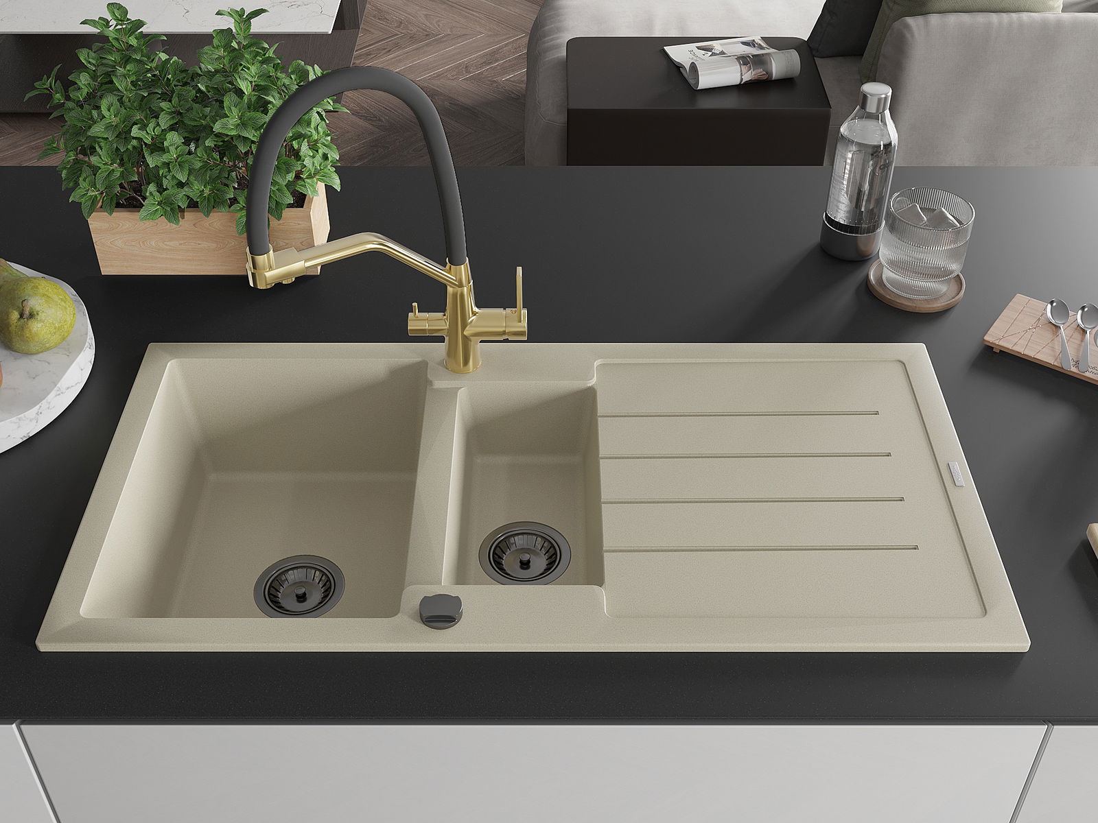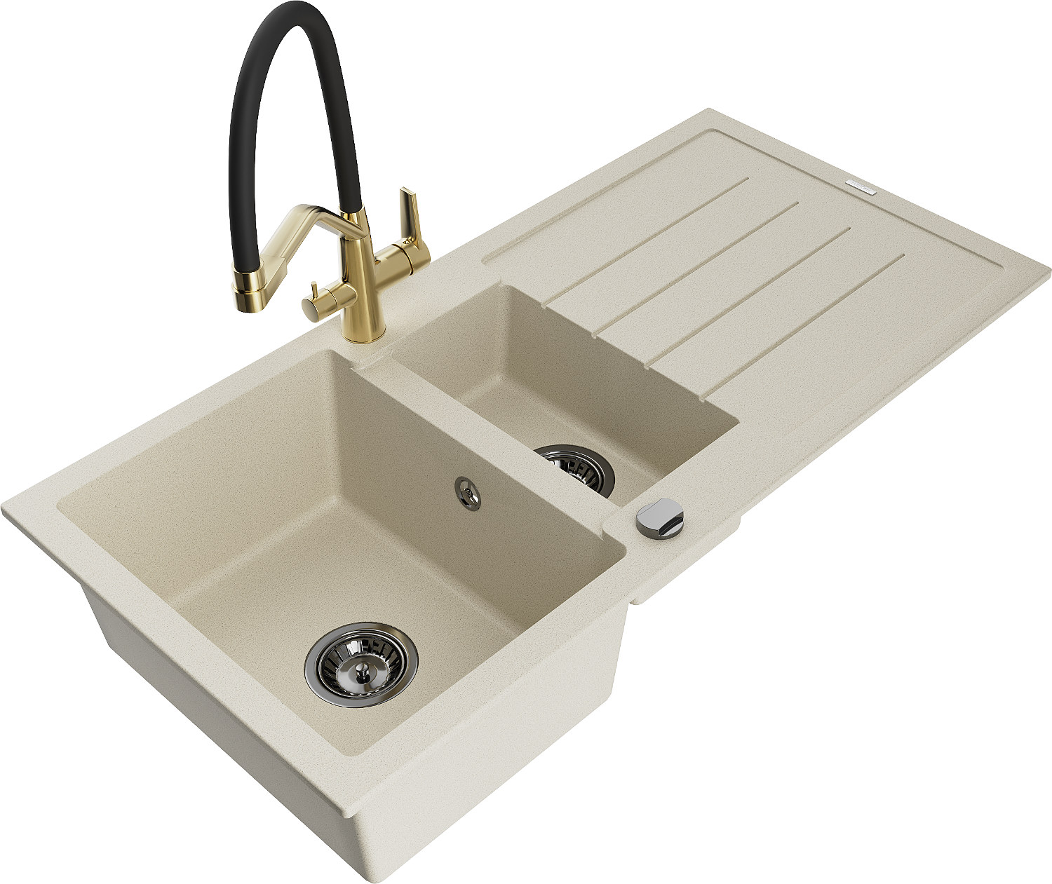 Mexen Andres gránit mosogató 1,5 medencés csepegtetővel és Duo konyhai csappal, bézs - 6515-69-671701-57-B