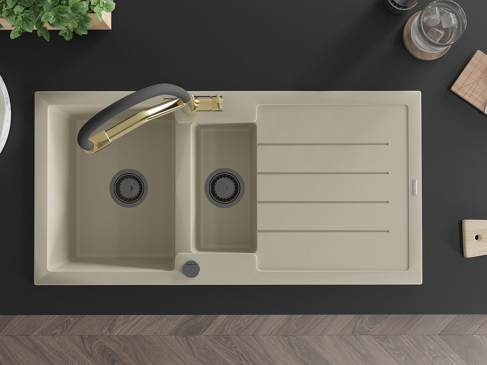 A mosogató kiváló minőségű gránitból készül. Ez egy elegáns és mindenekelőtt minden konyhához praktikus kiegészítés, stílusától függetlenül. A kiváló minőségű és a gránit tartósság biztosítja a sok éves használatát.