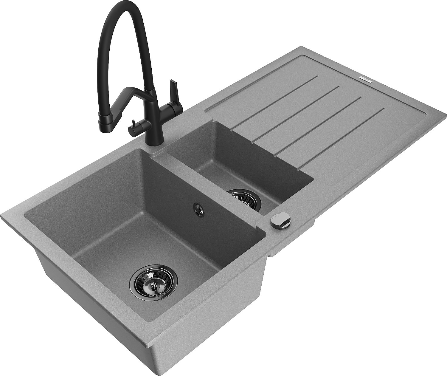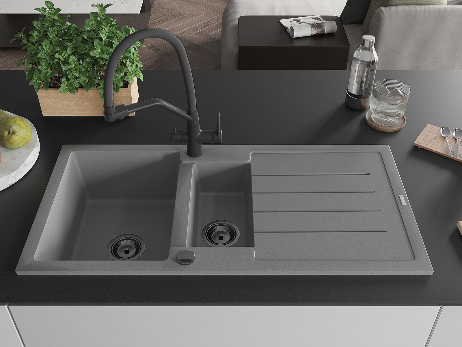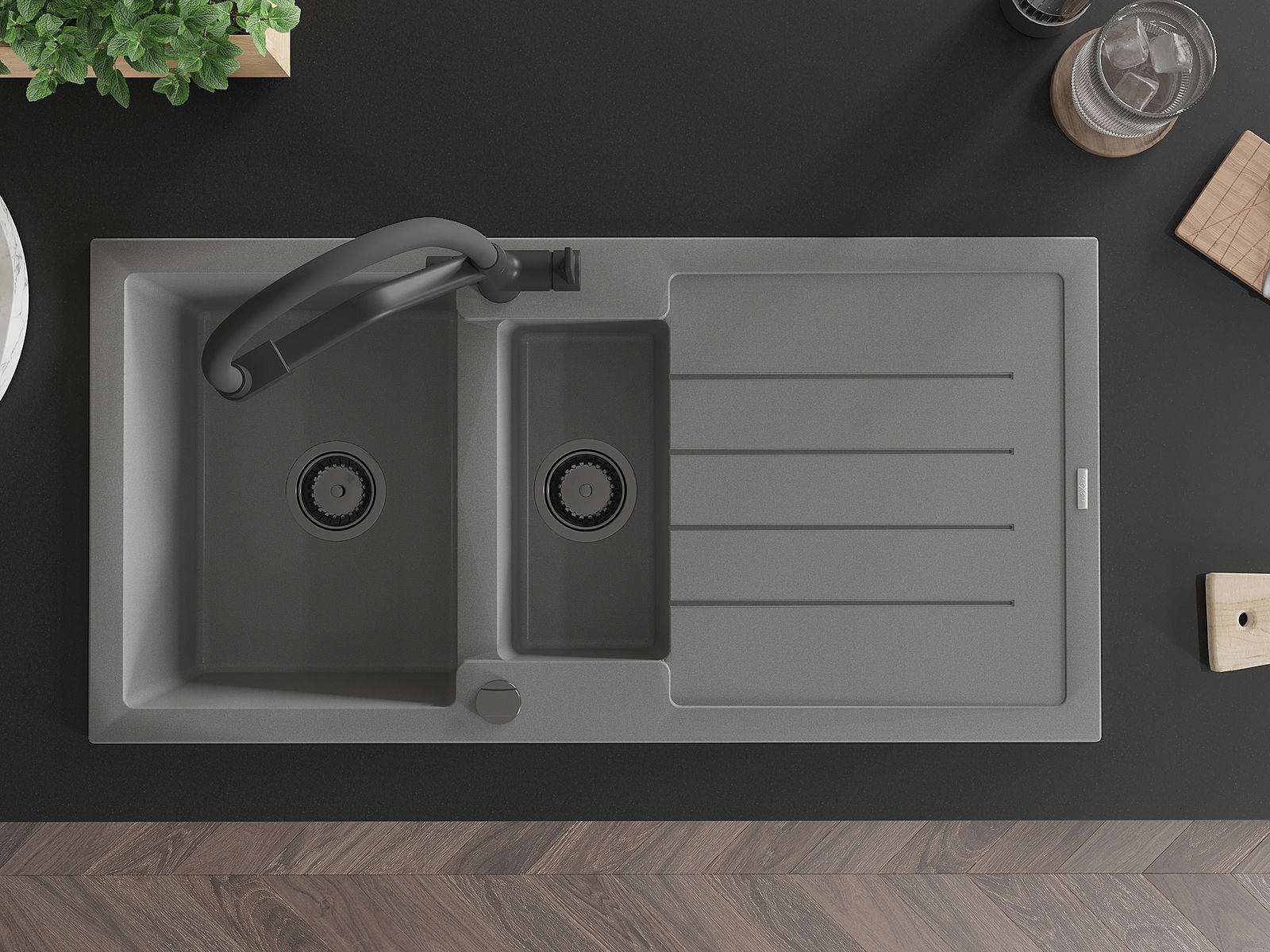Mexen Andres 1,5 rekeszes, szürke gránitmosogató lecsepegtetővel és Duo konyhai csappal - 6515-71-671701-70-B