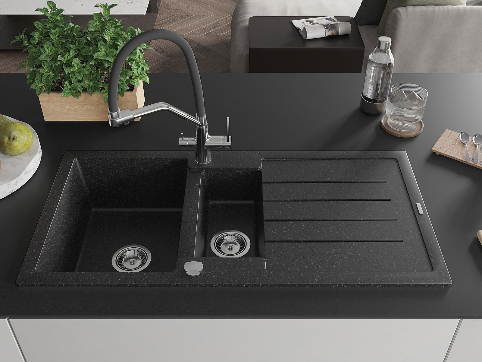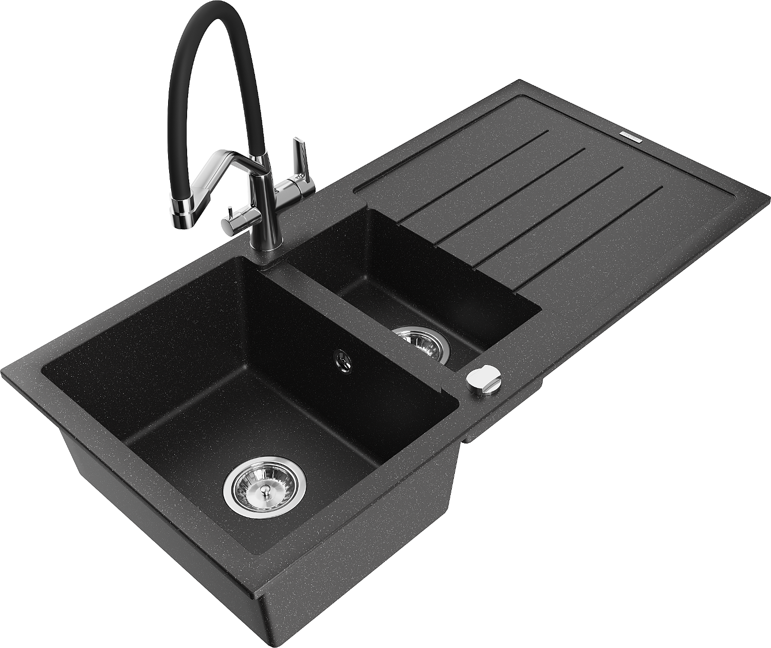 Mexen Andres gránit mosogatótálca, 1,5 rekeszes, csepegtetővel és Duo konyhai csappal, fekete/ezüst metál - 6515-73-671701-07