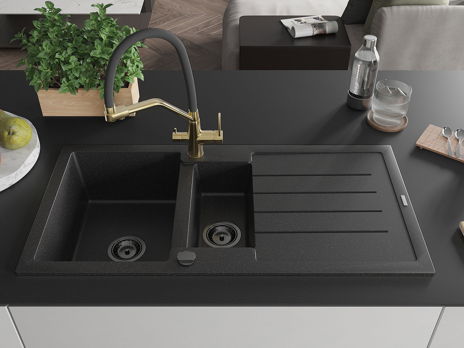 A mosogató 2 összekapcsolt lyukkal rendelkezik, amelynek átmérője 35 mm, önmagában. Felhasználhatók többek között Olyan folyékony adagoló rögzítéséhez, amely kiküszöböli a műanyag palackok jelenlétét a konyhában, és elegáns kivitelben adja meg.