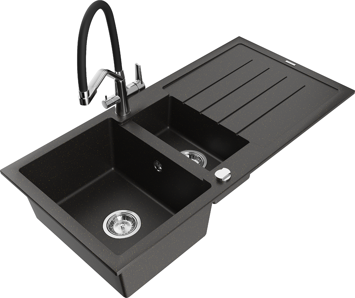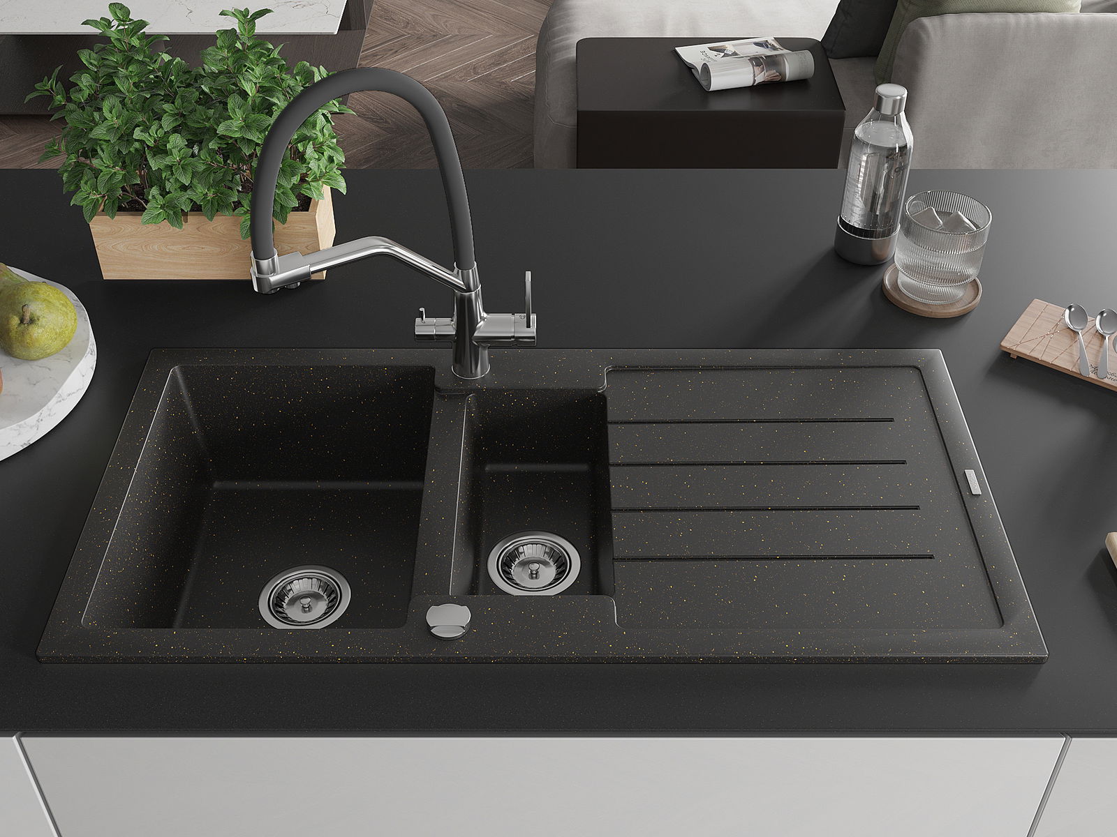 Mexen Andres gránit mosogató 1,5-medencés edényszárítóval és Duo konyhai csapteleppel, fekete/arany metál - 6515-75-671701-07
