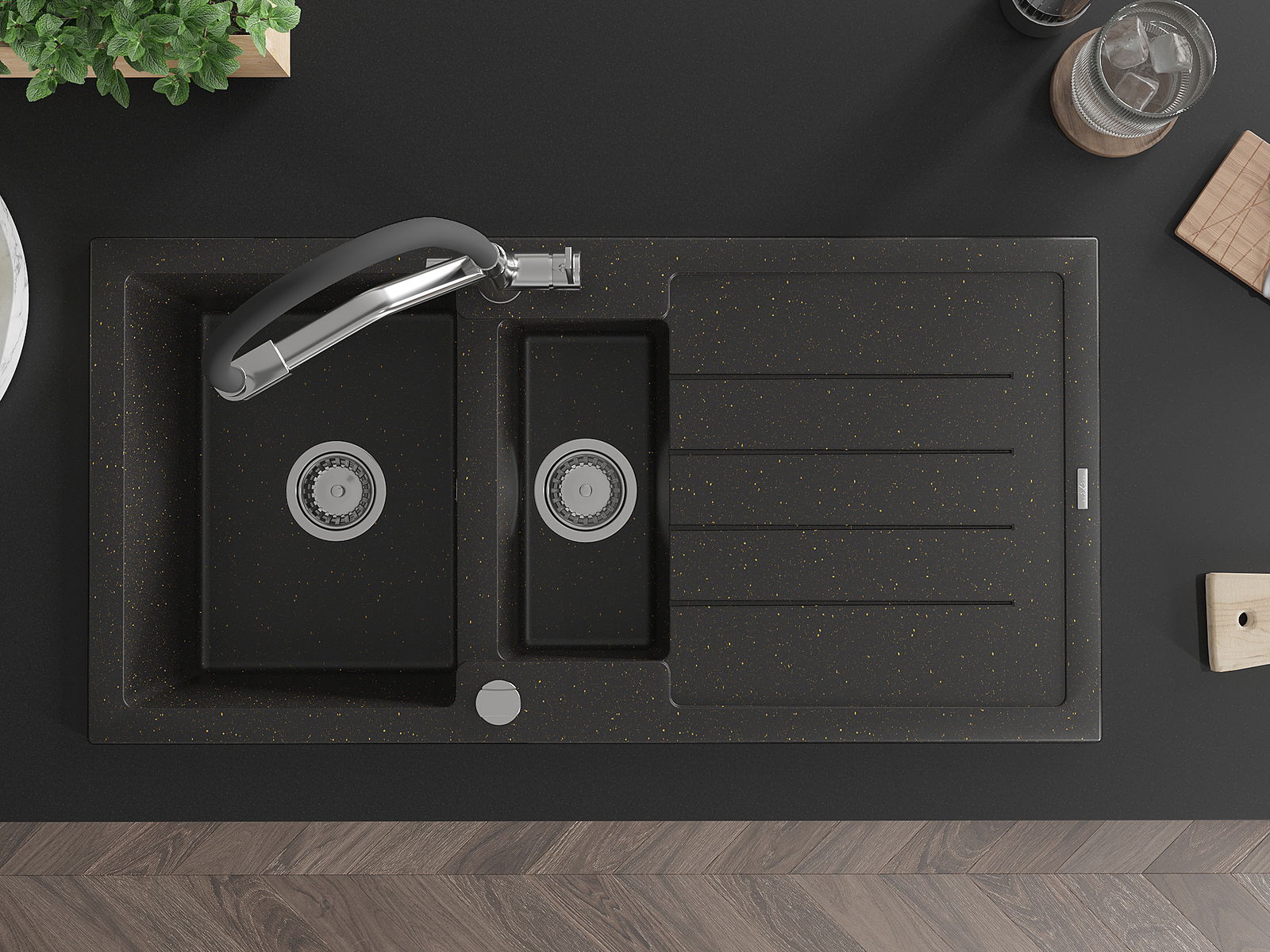 A mosogató 2 összekapcsolt lyukkal rendelkezik, amelynek átmérője 35 mm, önmagában. Felhasználhatók többek között Olyan folyékony adagoló rögzítéséhez, amely kiküszöböli a műanyag palackok jelenlétét a konyhában, és elegáns kivitelben adja meg.