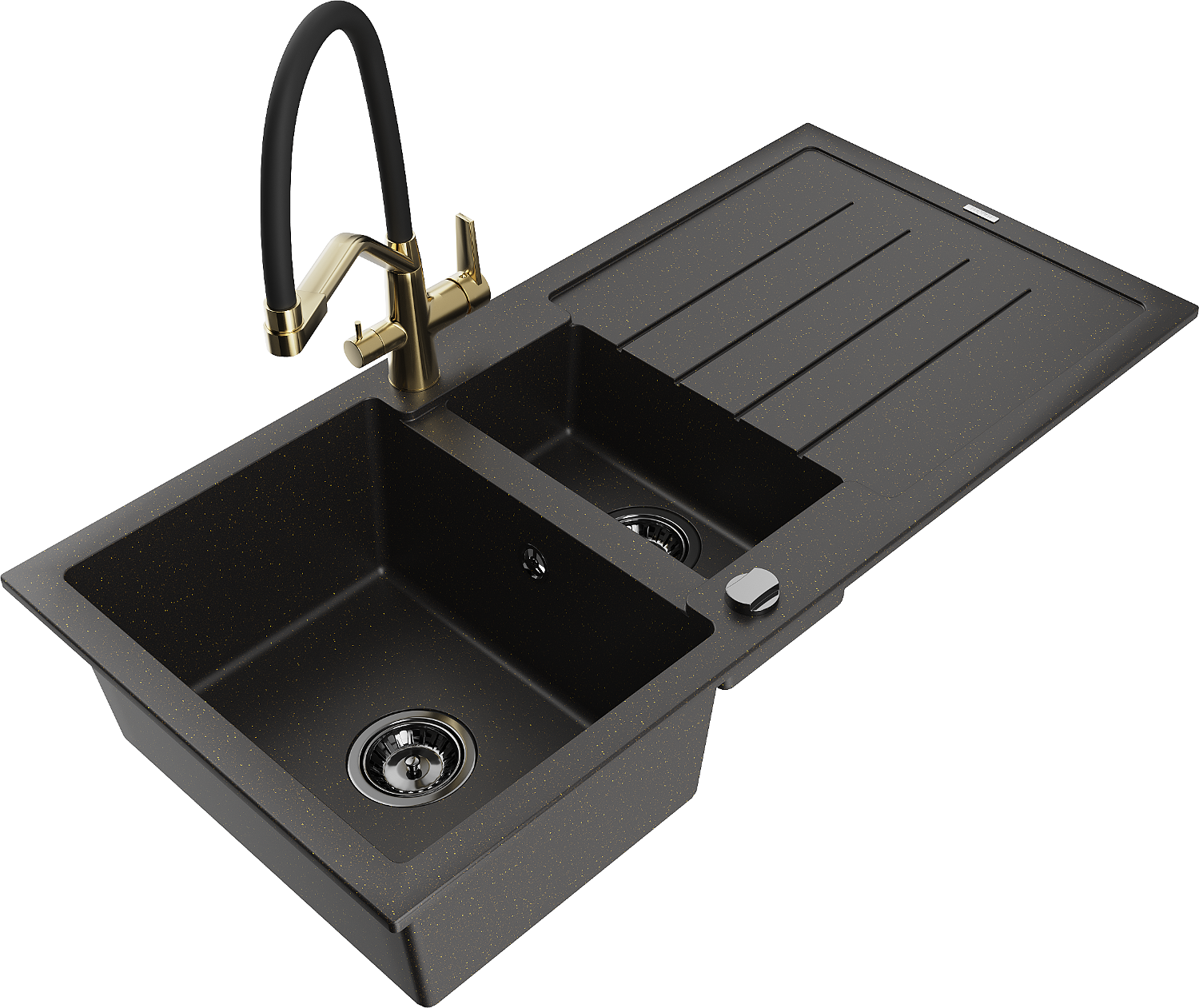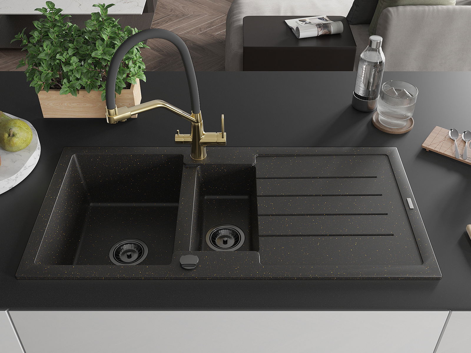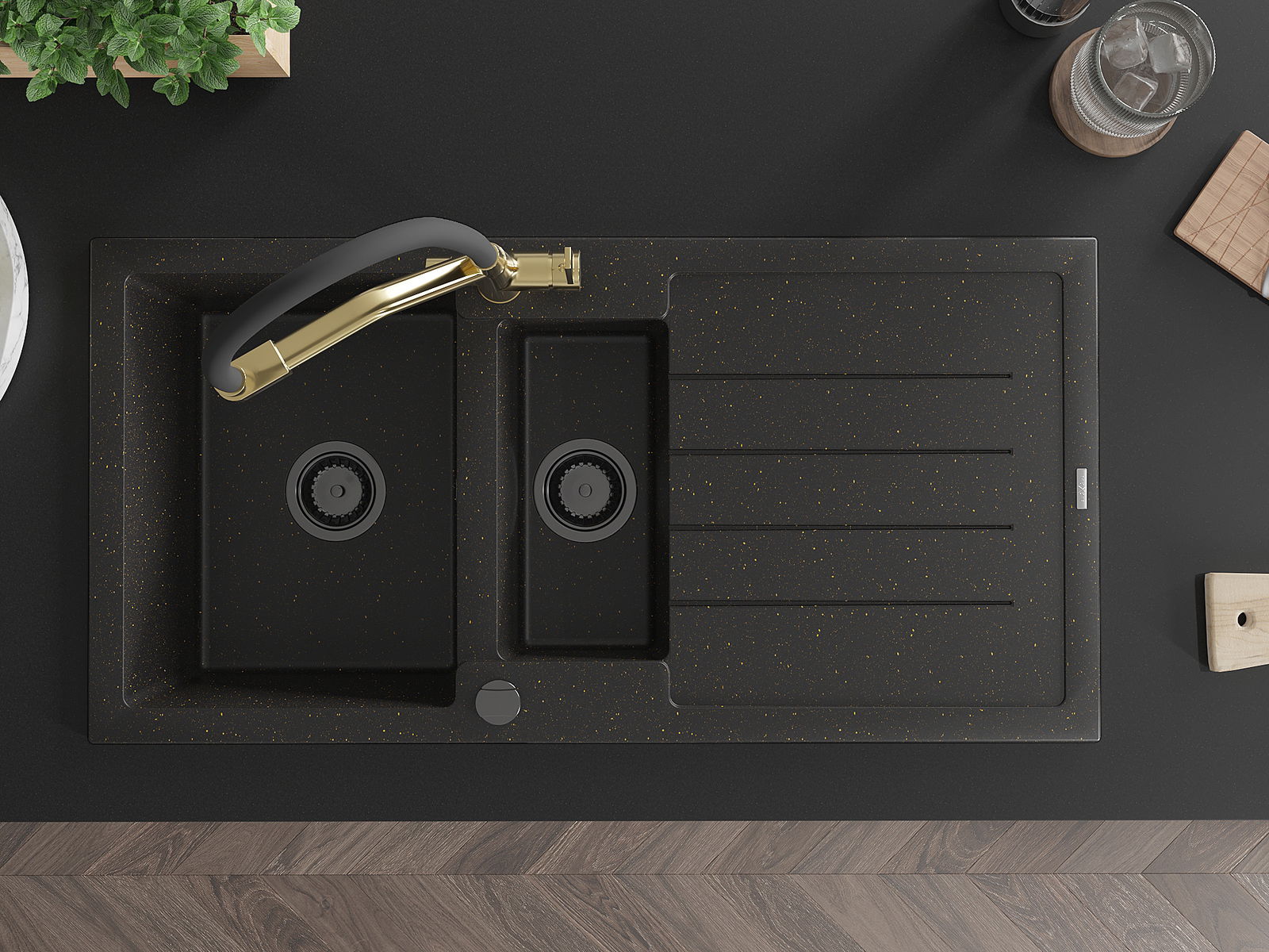 Mexen Andres gránit mosogató 1,5-medencés csepegtetővel és Duo konyhai csapteleppel, fekete/arany metál - 6515-75-671701-57-B