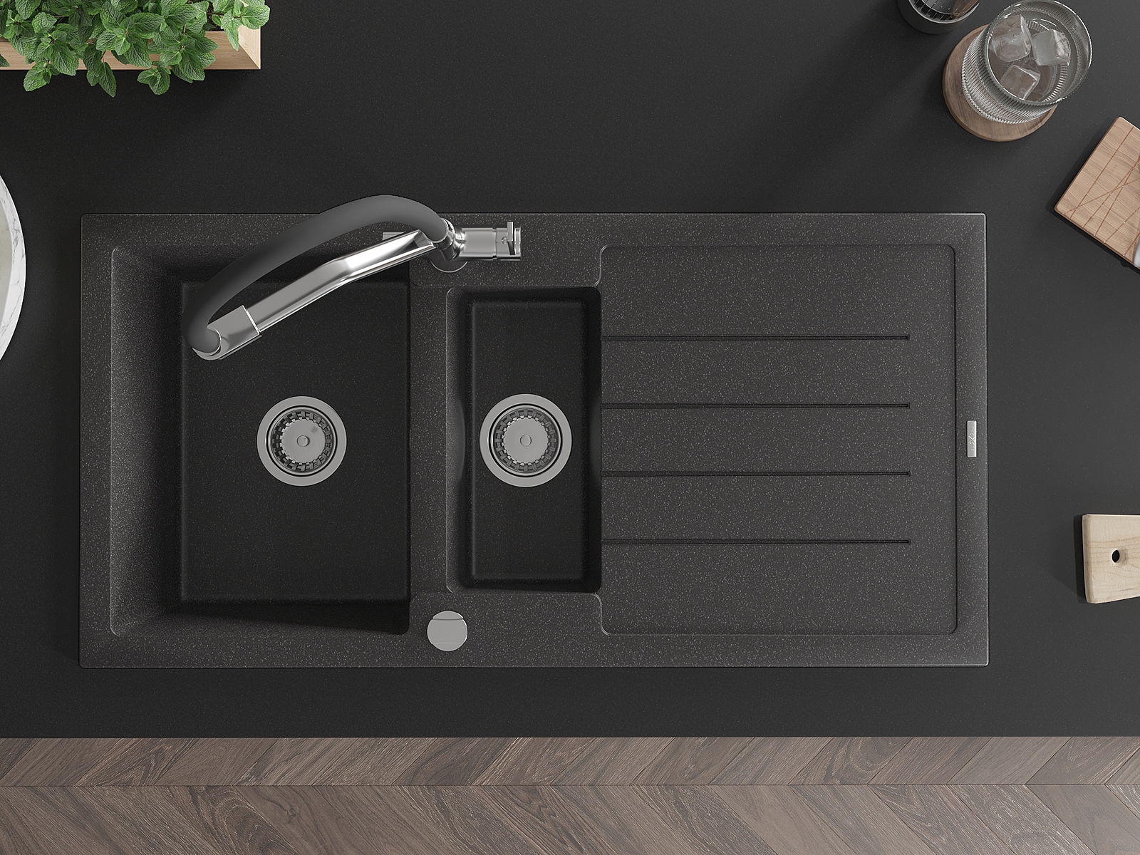 Mexen Andres 1,5-medencés gránit mosogató elfolyóval és Duo konyhai csapteleppel, fekete pöttyös - 6515-76-671701-07