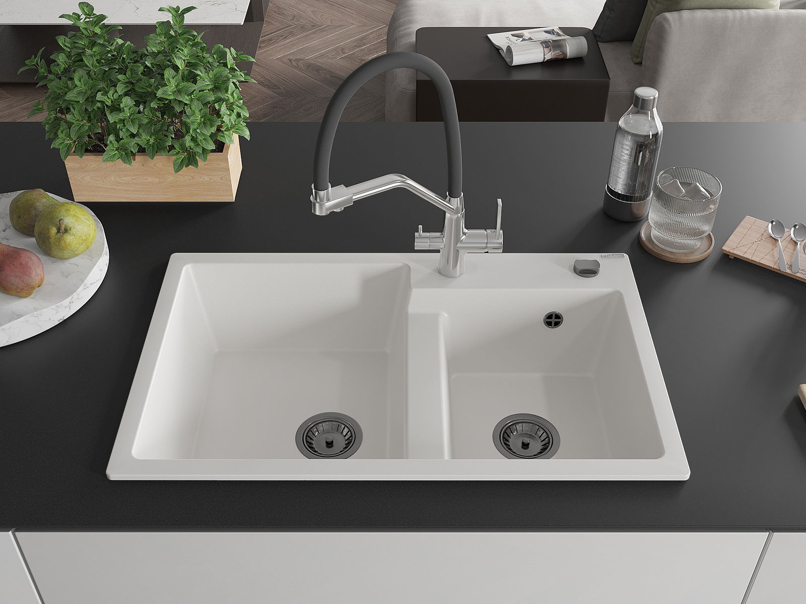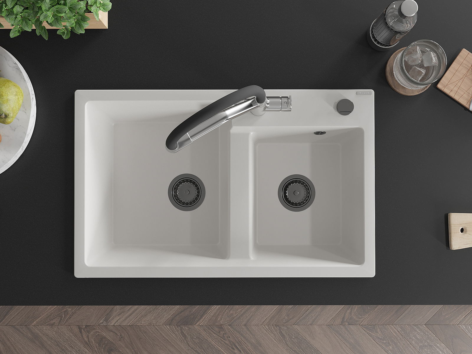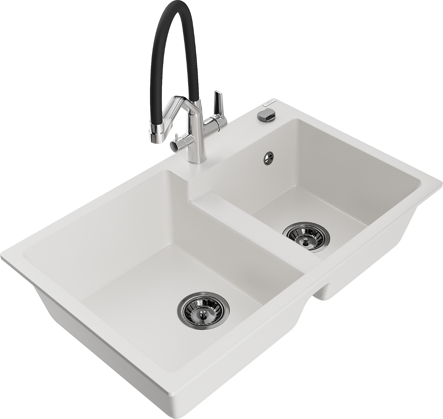 Mexen Tomas gránit mosogató 2-medencés konyhai csappal Duo, fehér - 6516-20-671701-07-B