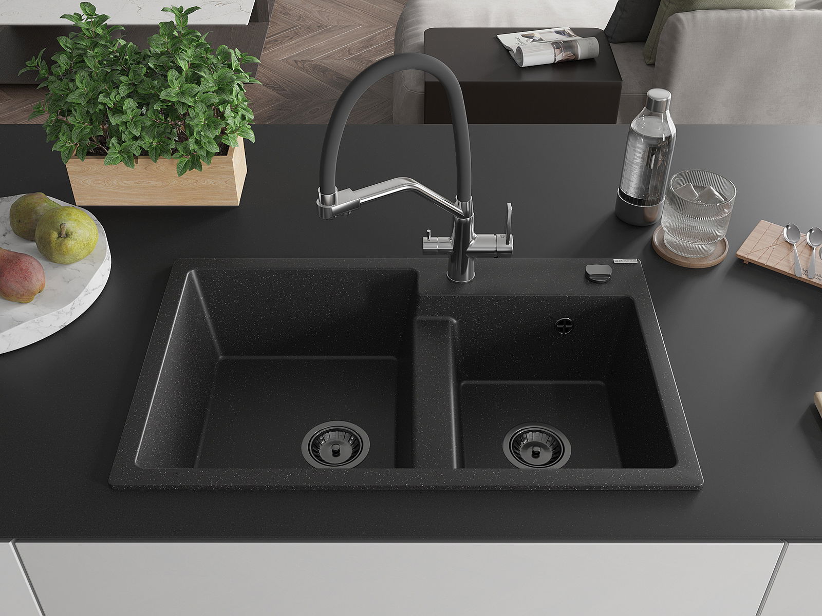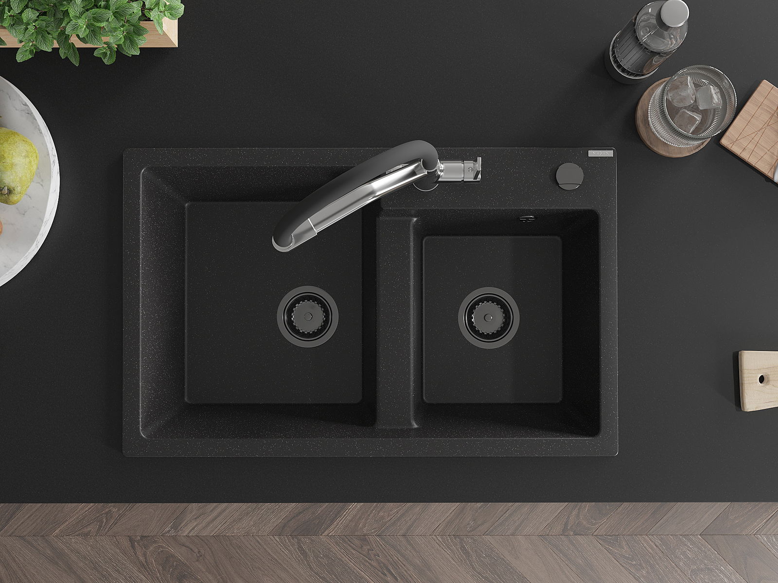 Mexen Tomas gránit mosogató 2 rekeszes konyhai csapteleppel Duo, fekete/ezüst metál - 6516-73-671701-07-B