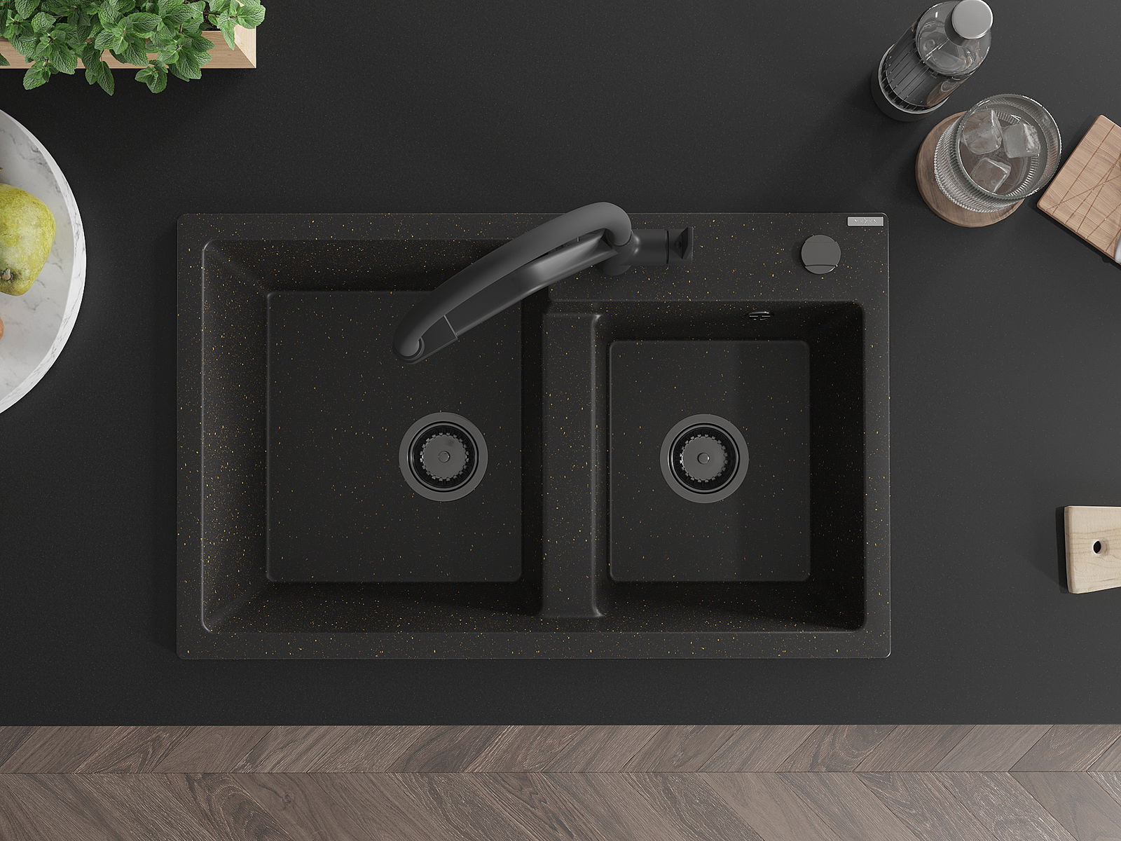Mexen Tomas kétmedencés gránit mosogató Duo konyhai csappal, fekete/arany metál - 6516-75-671701-70-B