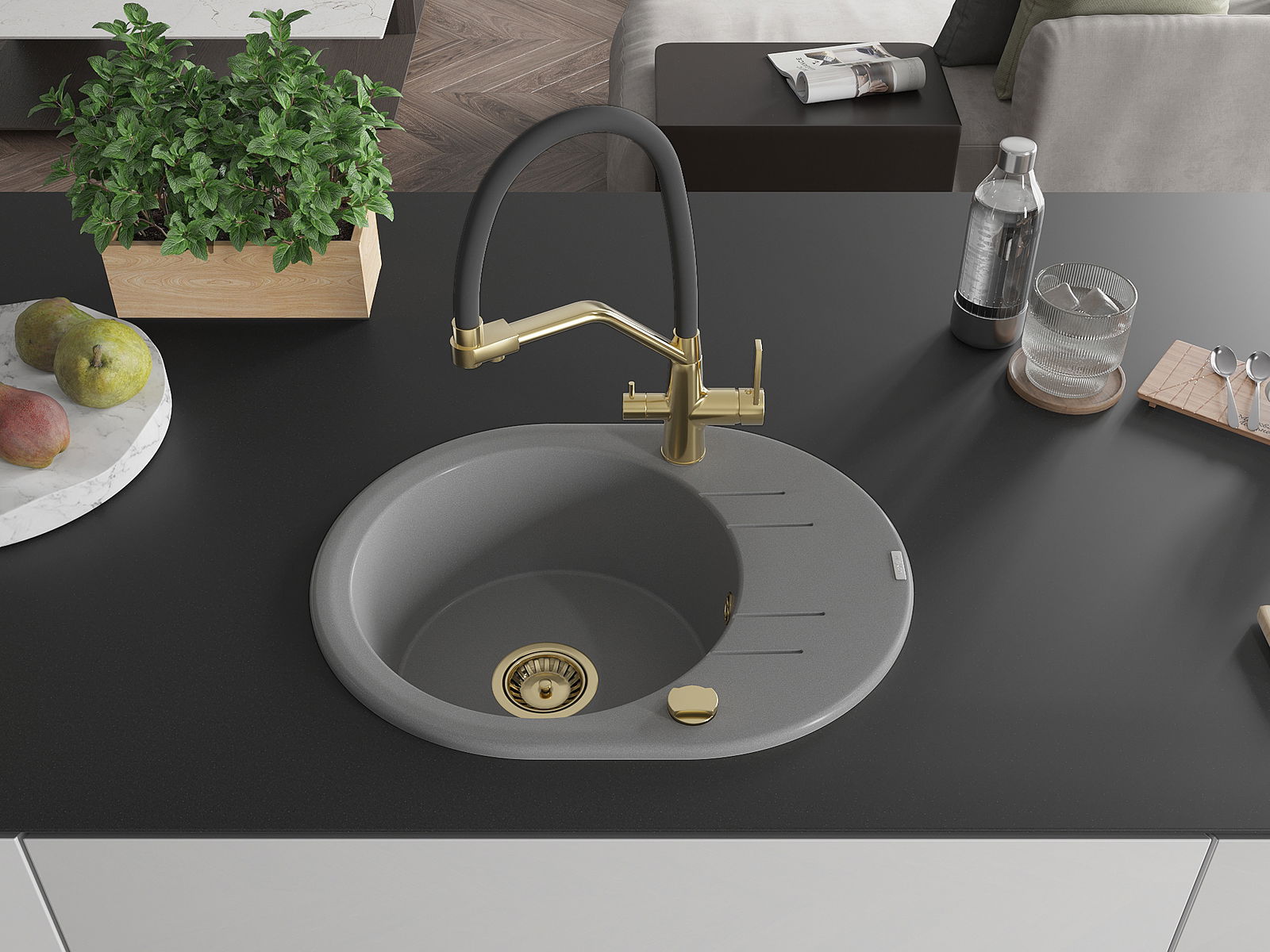 A mosogató kiváló minőségű gránitból készül. Ez egy elegáns és mindenekelőtt minden konyhához praktikus kiegészítés, stílusától függetlenül. A kiváló minőségű és a gránit tartósság biztosítja a sok éves használatát.