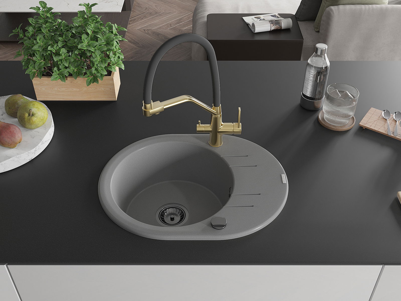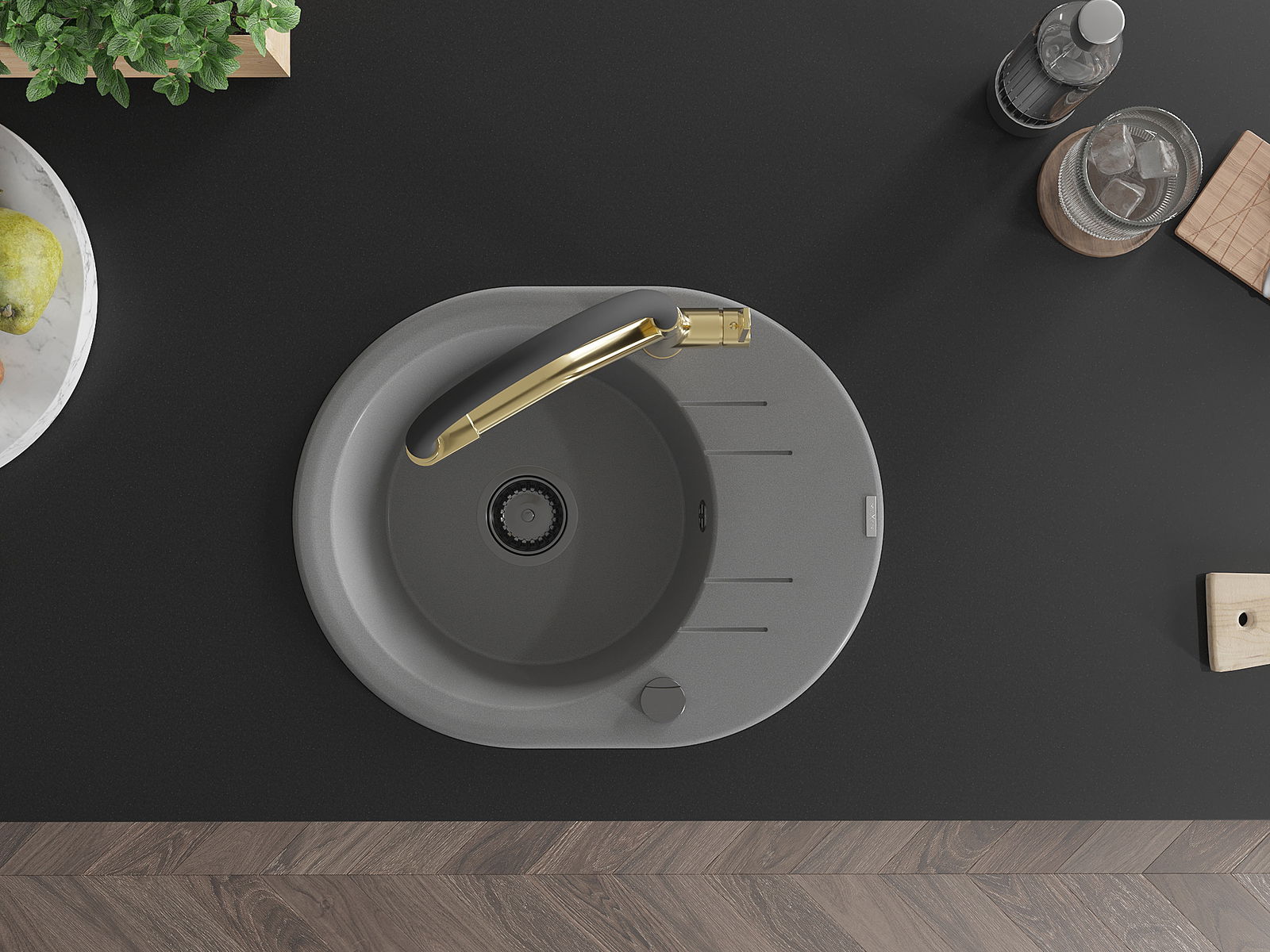 A mosogató kiváló minőségű gránitból készül. Ez egy elegáns és mindenekelőtt minden konyhához praktikus kiegészítés, stílusától függetlenül. A kiváló minőségű és a gránit tartósság biztosítja a sok éves használatát.