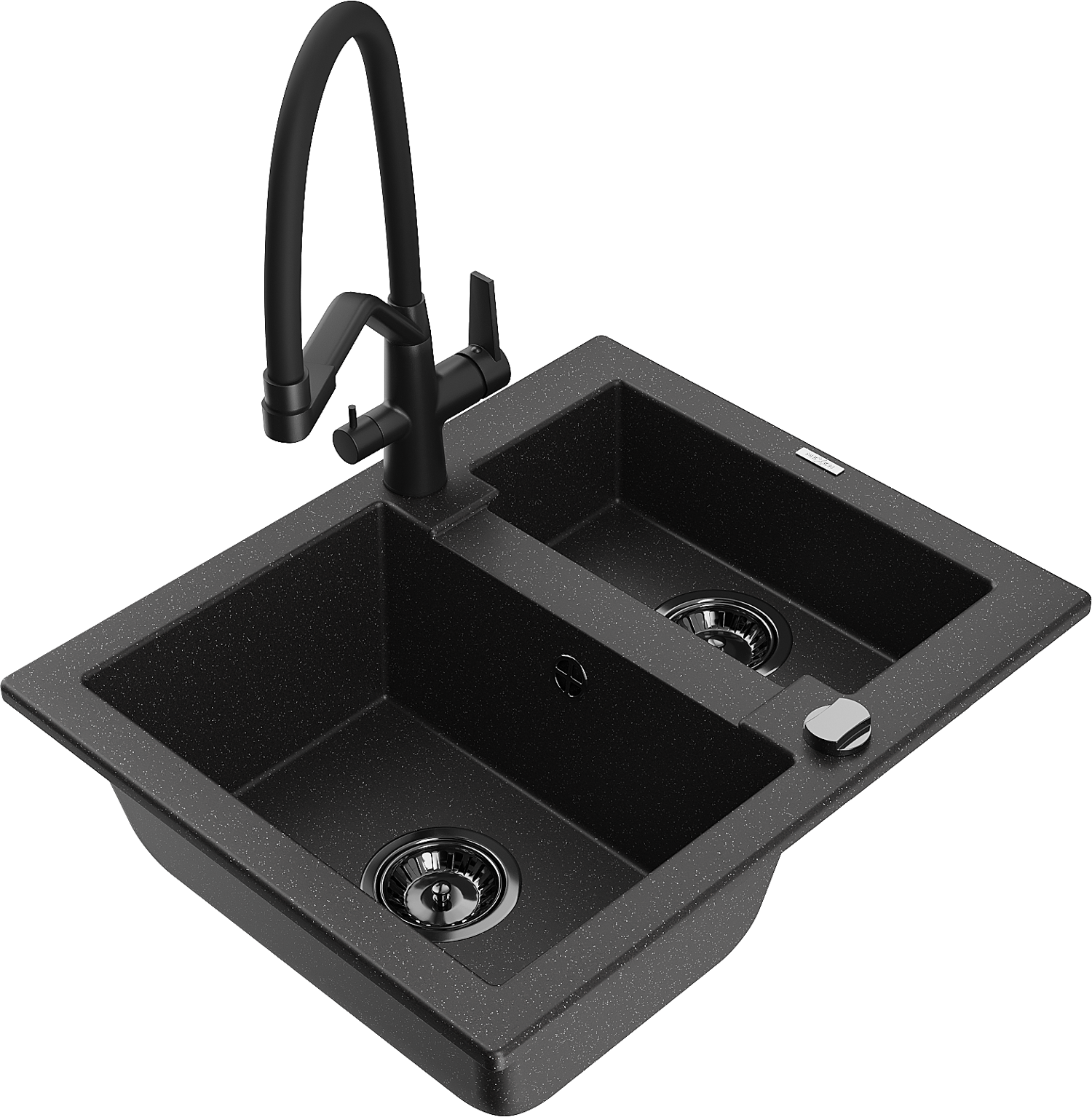 Mexen Carlos gránit mosogatótálca 1,5 rekeszes konyhai csappal Duo, fekete/ezüst metál - 6518-73-671701-70-B