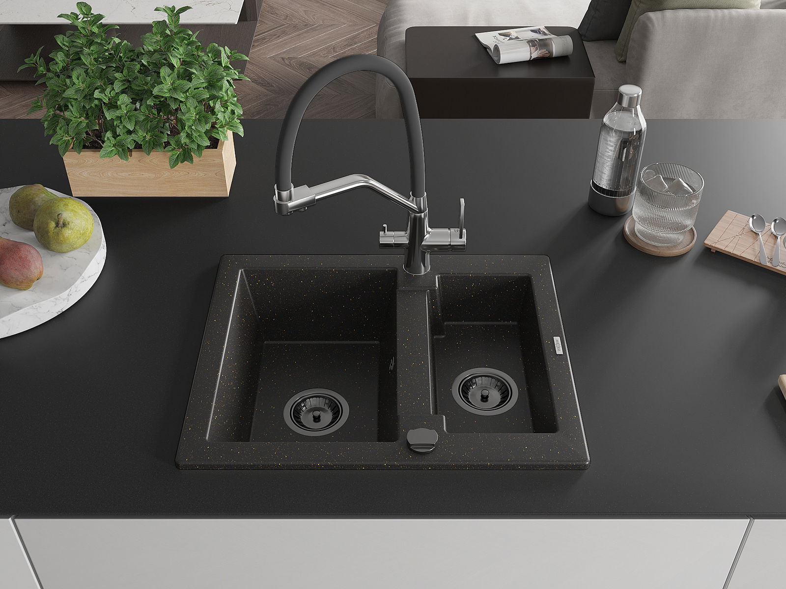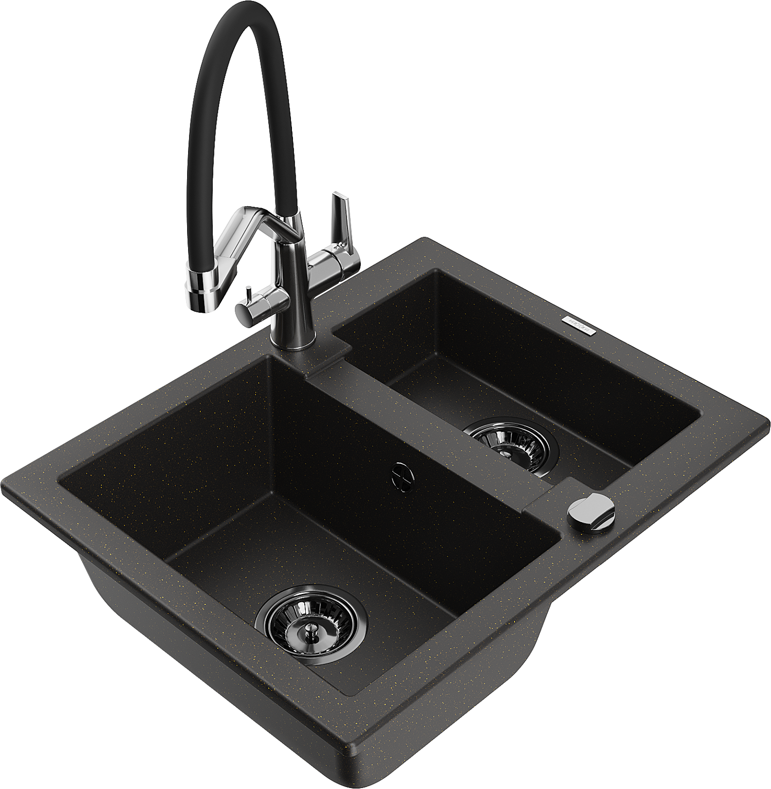 Mexen Carlos 1,5 rekeszes gránit mosogató Duo konyhai csappal, fekete/arany metál - 6518-75-671701-07-B