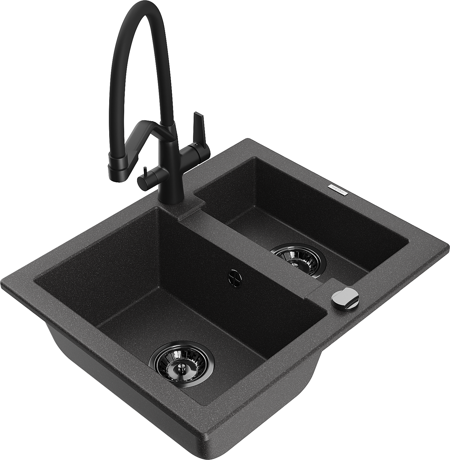 Mexen Carlos gránit mosogató 1,5 rekeszes Duo konyhai csapteleppel, fekete, pettyezett - 6518-76-671701-70-B