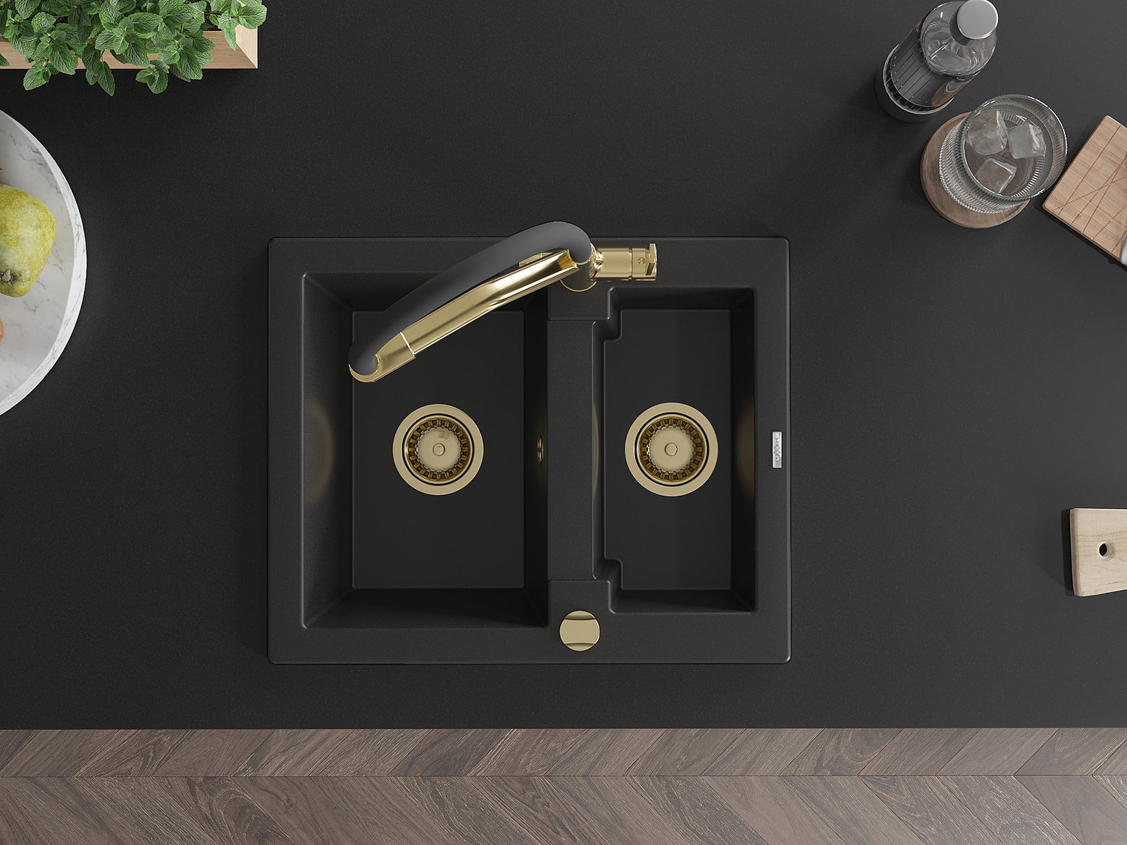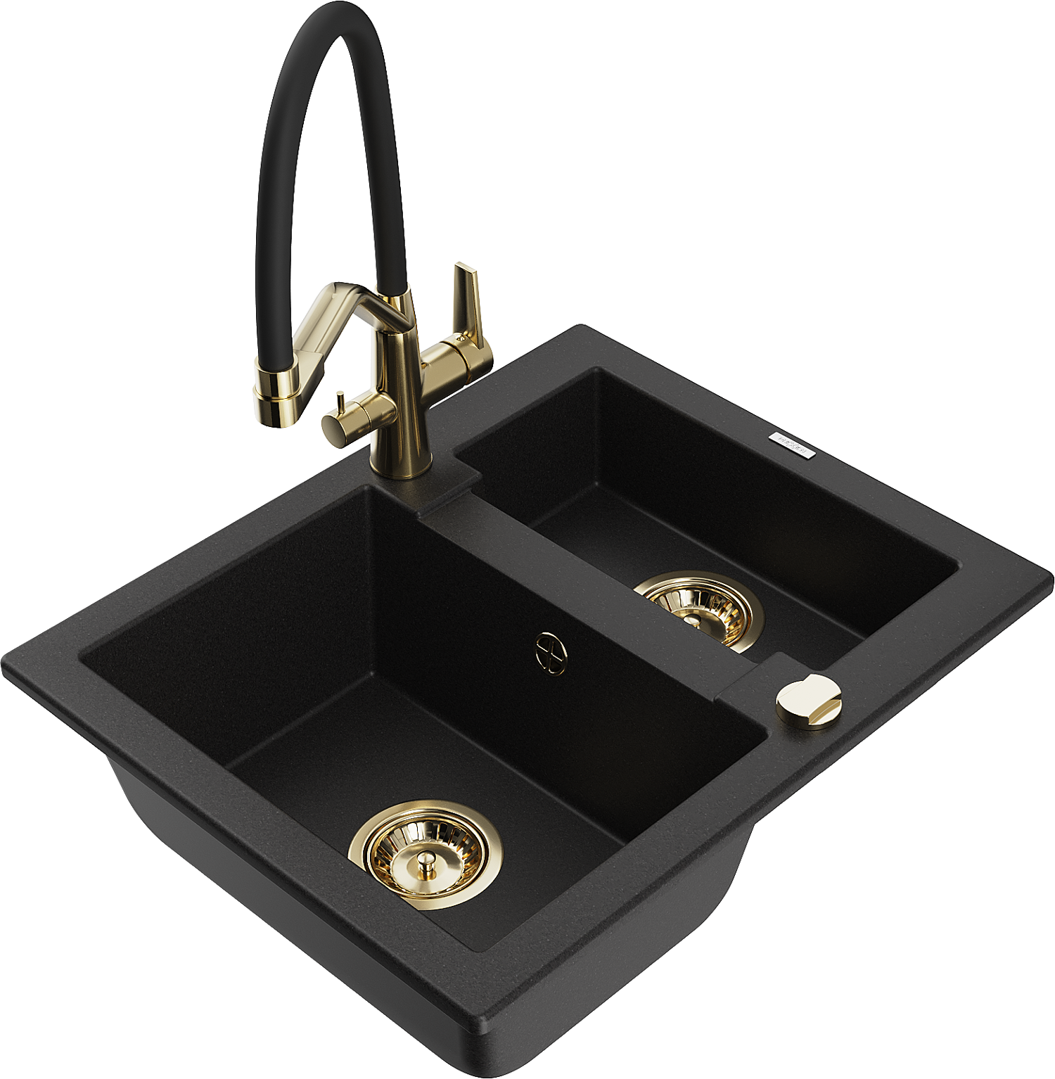 Mexen Carlos gránitmosogató 1,5 medencés Duo konyhai csappal, fekete - 6518-77-671701-57-G