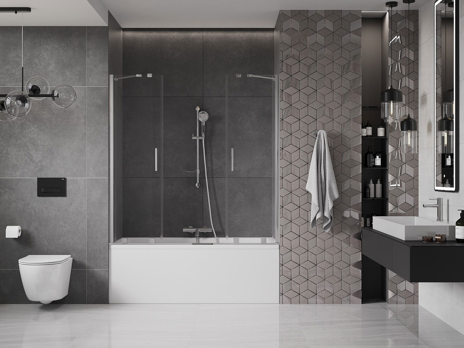 Az univerzális rögzítő rendszer használatával a képernyő jobbra vagy balra szerelhető, az Ön igényeitől függően. Ilyen módon könnyen megtervezheti a fürdőszobához szabott zuhanyt.