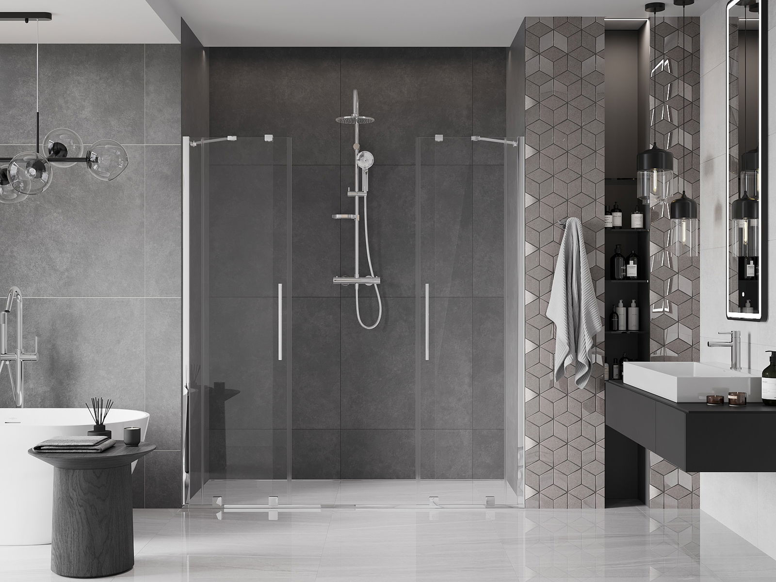 A praktikus és kényelmes fogantyú rozsdamentes acélból készült. A divatos forma a profilok színéhez illeszkedő kivitelezéssel kombinálva modern és elegáns megjelenést kölcsönöz az egésznek, amely minden fürdőszoba esztétikáját feldobja.