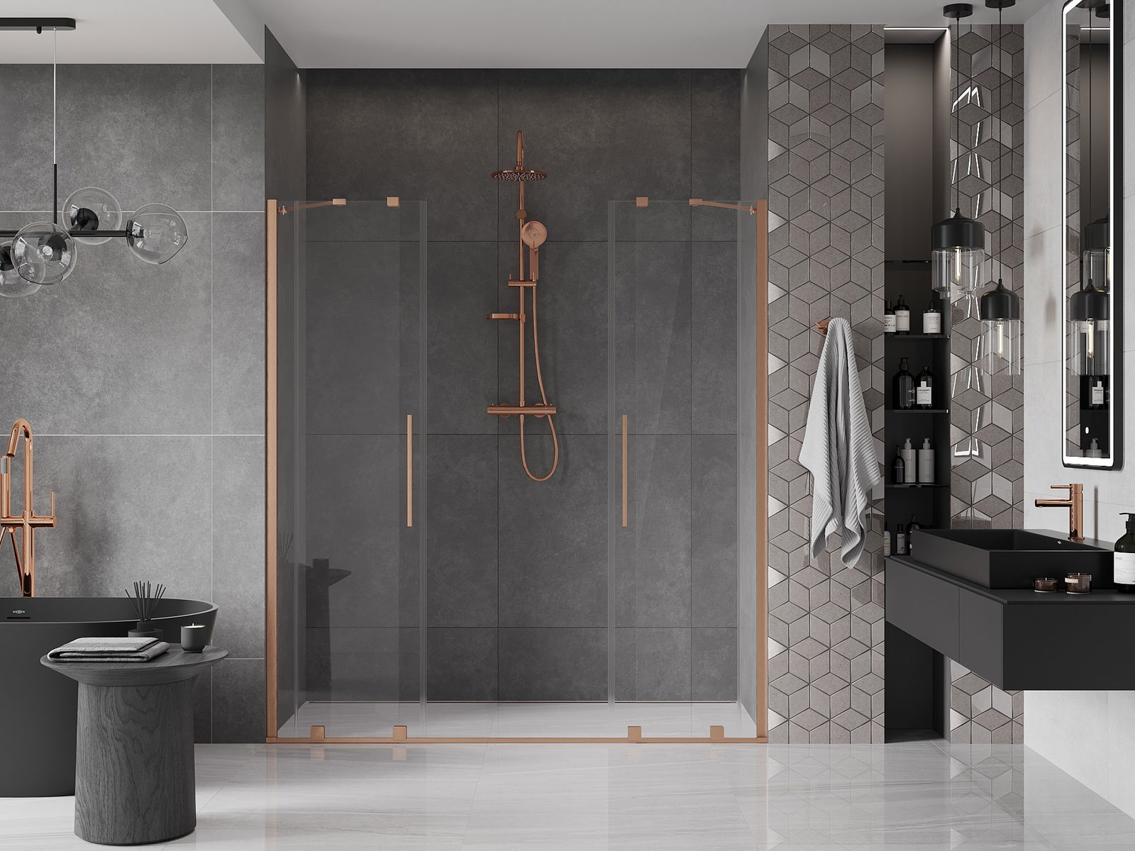 A praktikus és kényelmes fogantyú rozsdamentes acélból készült. A divatos forma a profilok színéhez igazított kivitelezéssel modern és stílusos megjelenést kölcsönöz az egésznek, kiemelve minden fürdőszoba esztétikáját.