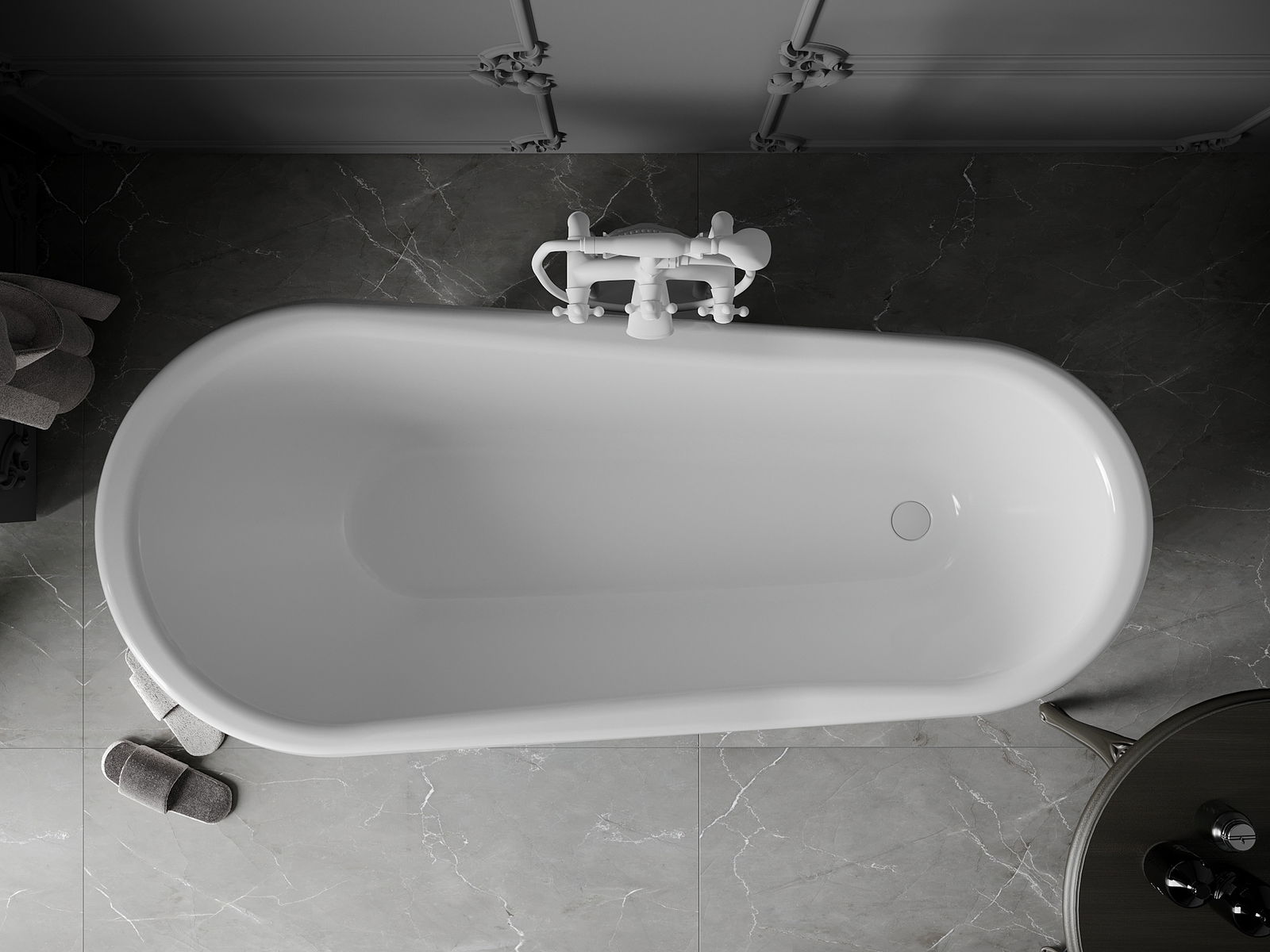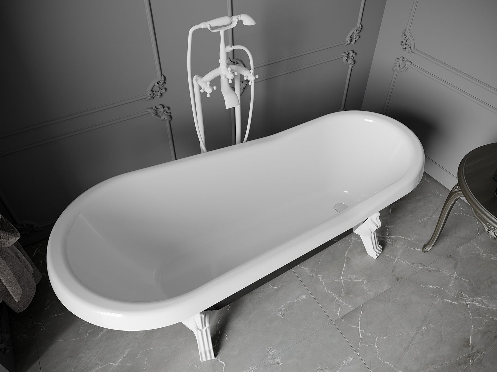 A fürdőkád állítható lábakkal van felszerelve, amelyek lehetővé teszik a kád kiegyenlítését akár egyenetlen felületen is. Gyakorlati megoldás, amely biztosítja a nagyobb stabilitást és biztonságot a használat és a telepítés megkönnyítése során.