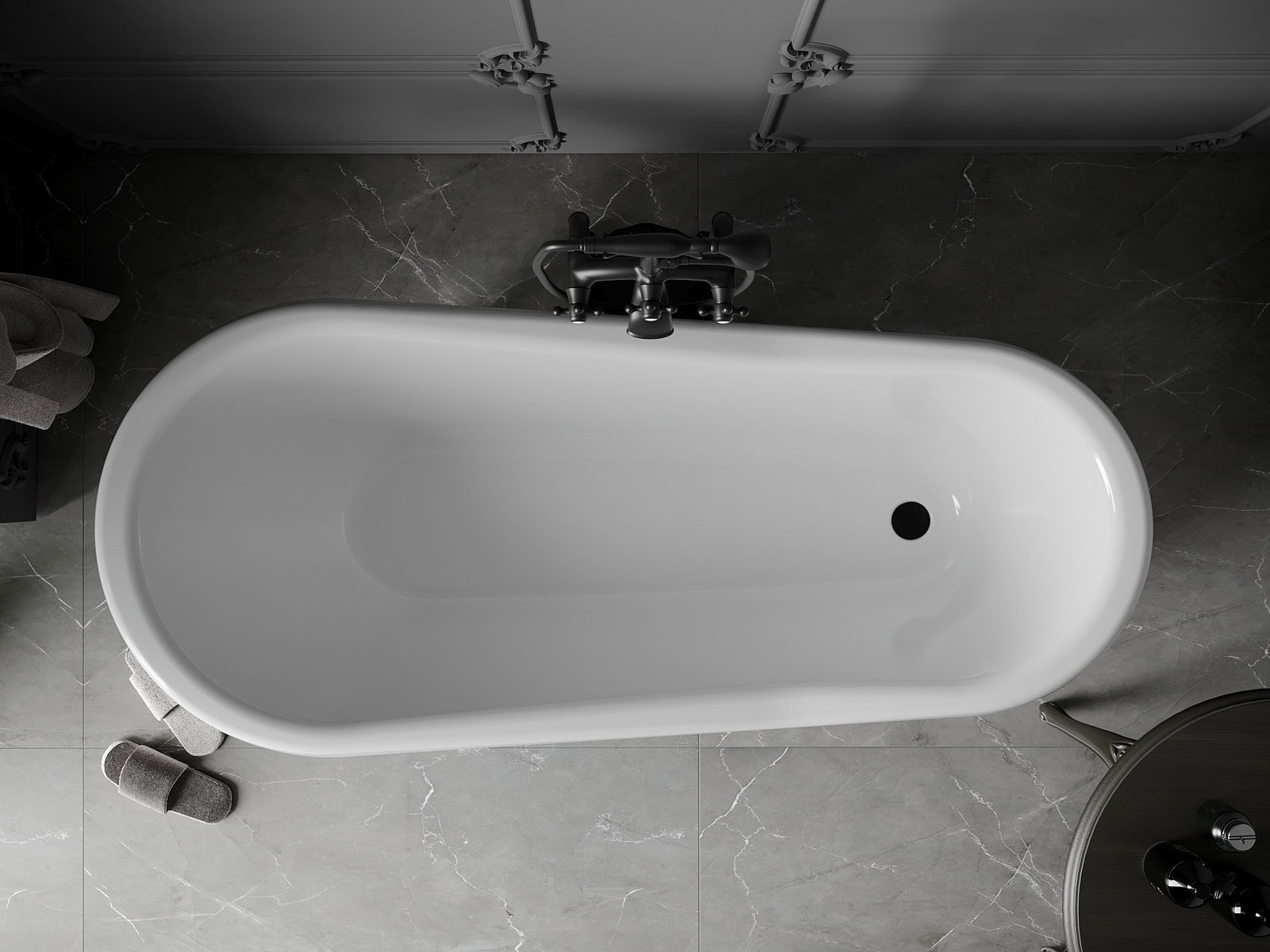 A fürdőkád állítható lábakkal van felszerelve, amelyek lehetővé teszik a kád kiegyenlítését akár egyenetlen felületen is. Gyakorlati megoldás, amely biztosítja a nagyobb stabilitást és biztonságot a használat és a telepítés megkönnyítése során.