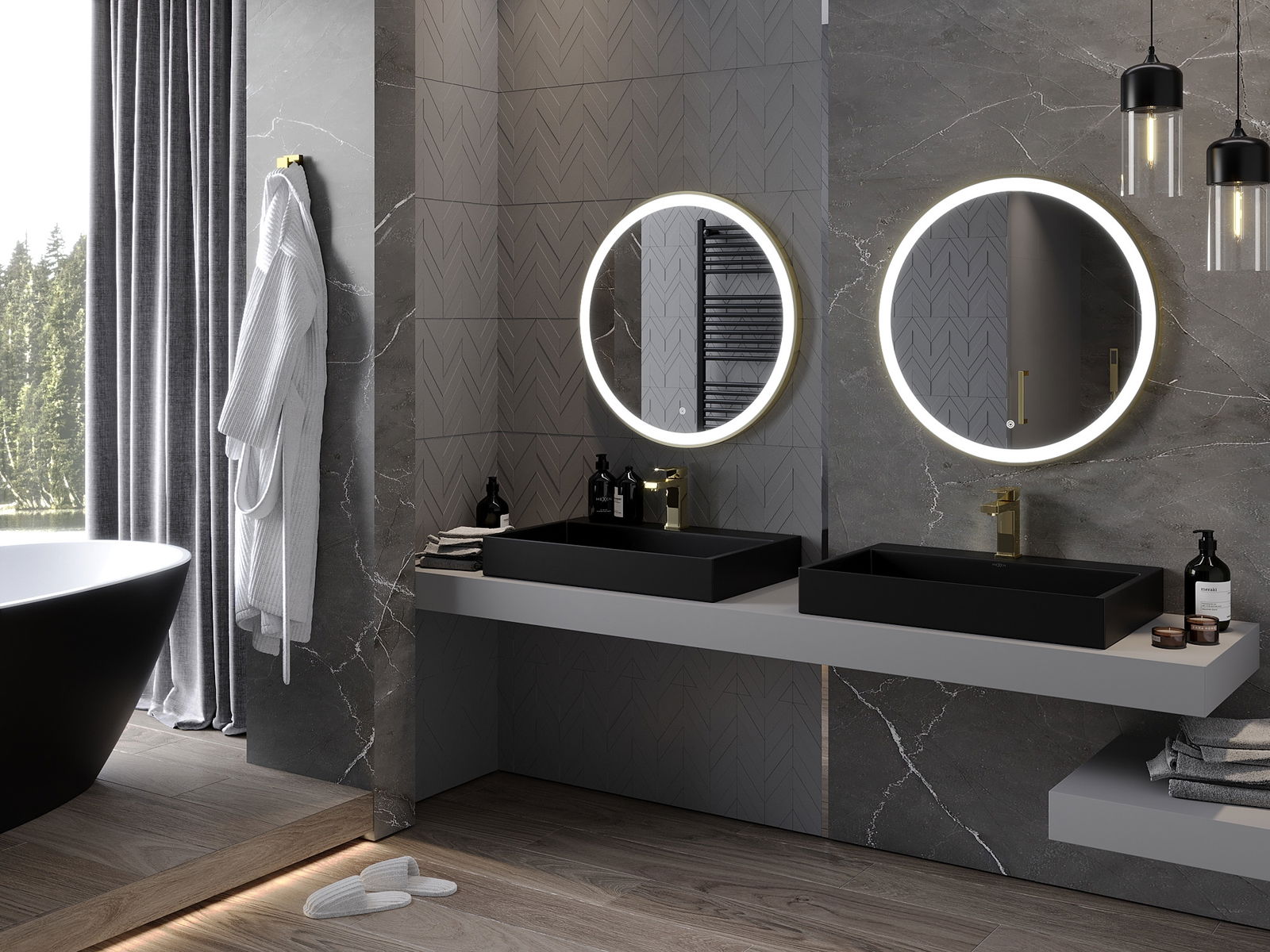 A LED -es háttérvilágítás a tükörnél egy gyakorlati elem, amely megkönnyíti a napi ellátást, az ideális arcvilágítás lehetőségének köszönhetően. A háttérvilágítás modern felületet ad a fürdőszobának, hangsúlyozva elegáns dekorációját.
