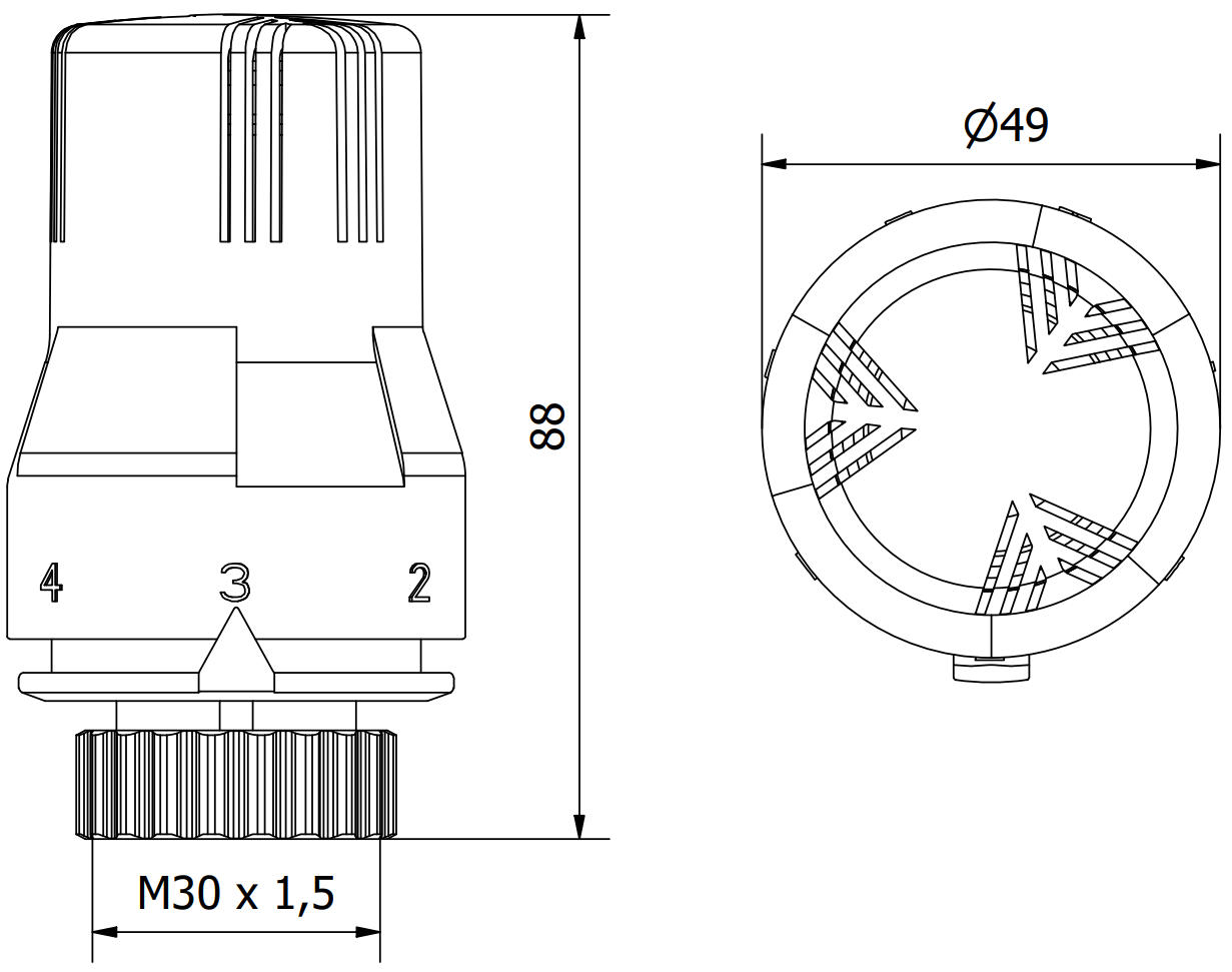 Ez egy szabványos menetterület, amelyet sok termosztatikus fejben használnak, különösen fűtési berendezésekben. Az M30 szimbólum jelentése a menet külső átmérője 30 mm, az 1,5 mm pedig a menetemelkedés 1,5 mm.
