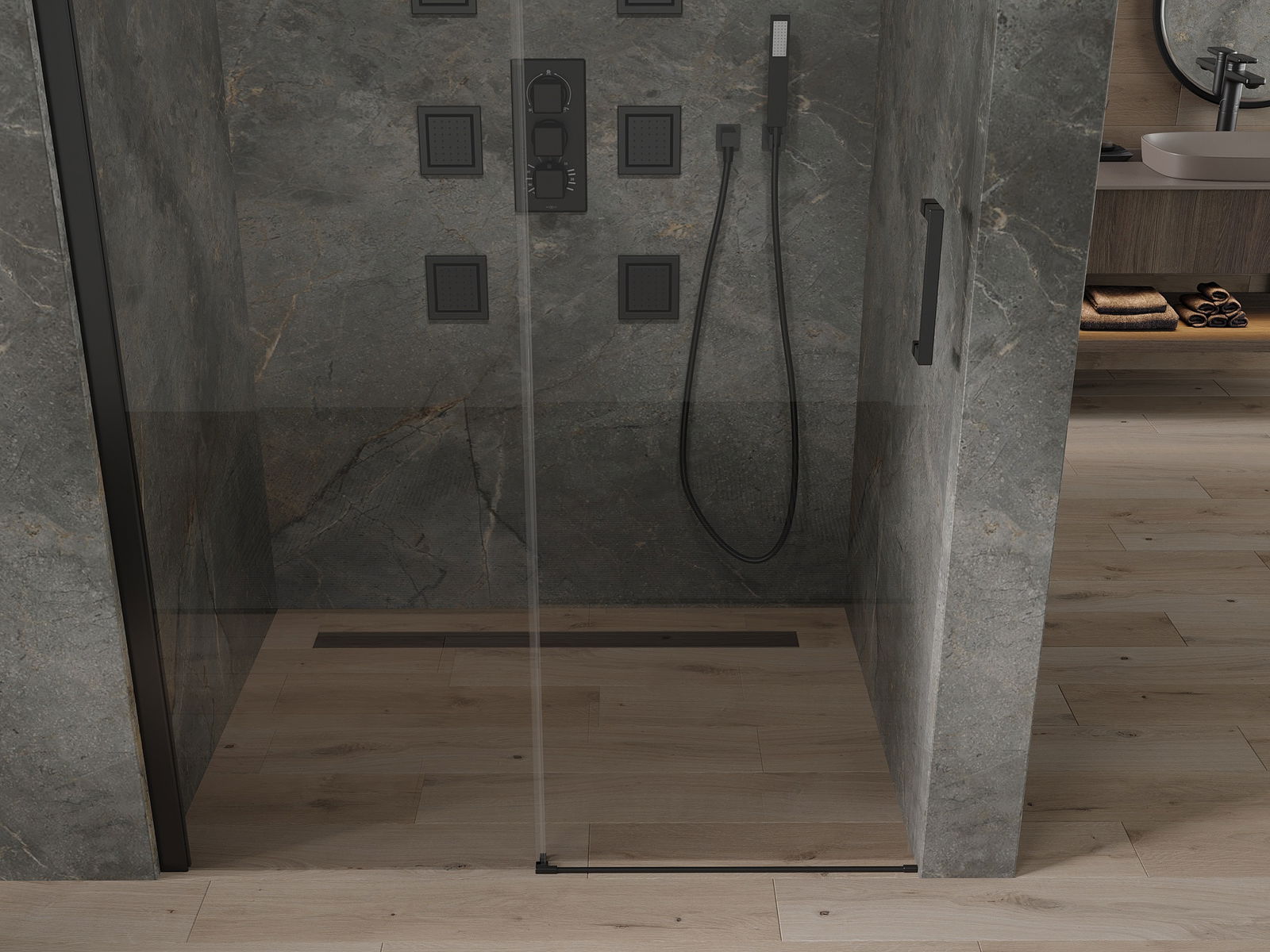 A praktikus és kényelmes fogantyú tartós és ellenálló fémből készült. A divatos forma és a profilok színéhez igazított bevonat modern és stílusos megjelenést ad, hangsúlyozva minden fürdőszoba esztétikáját.