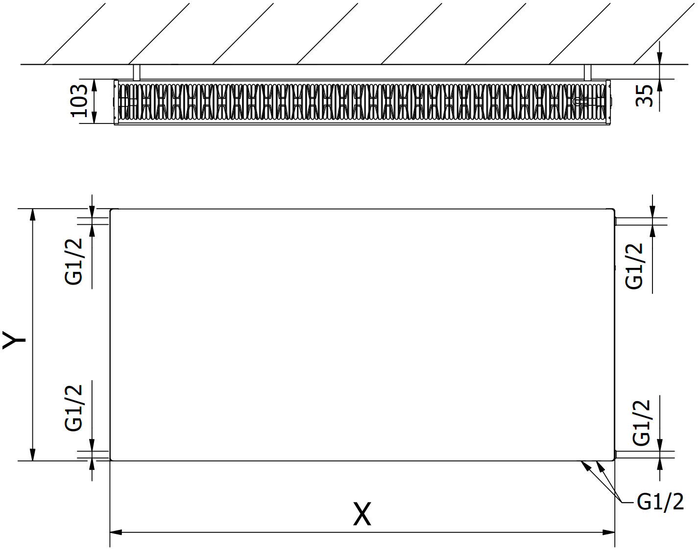A képek a 600 x 1200 mm méretű radiátort ábrázolják.