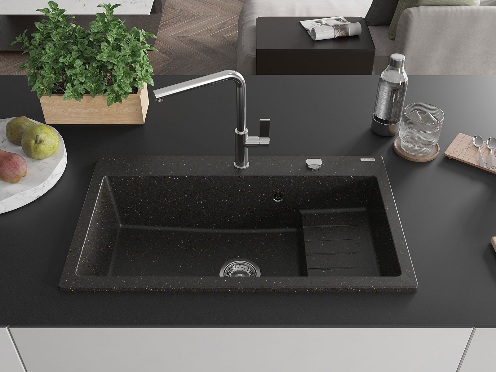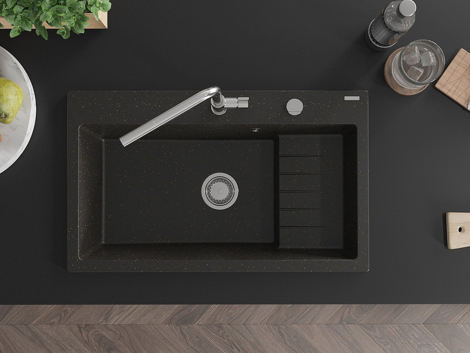 Mexen Omar 1 rekeszes gránit mosogató 800 x 480 mm, fekete/arany metál, króm szifon - 6520801005-75