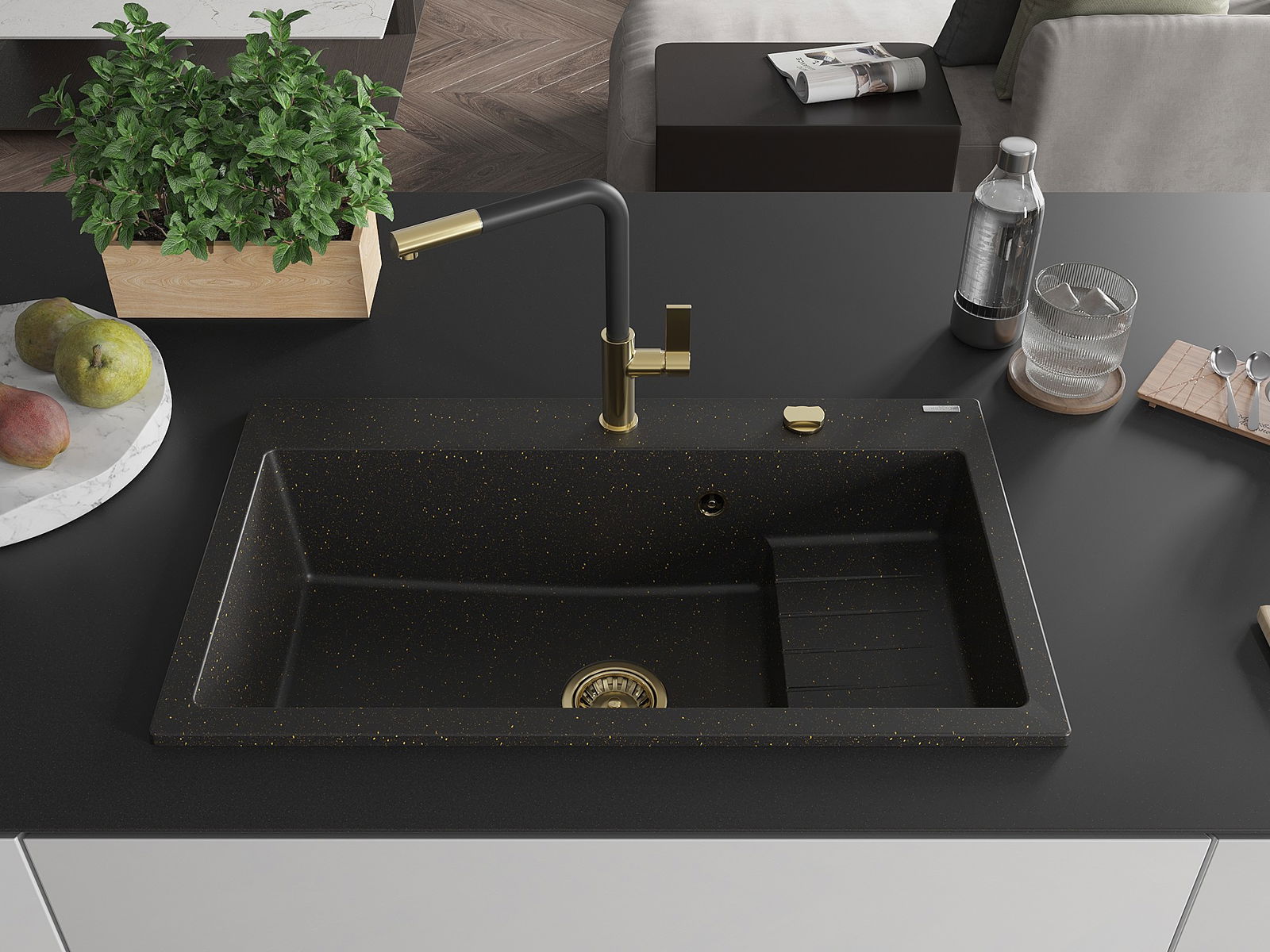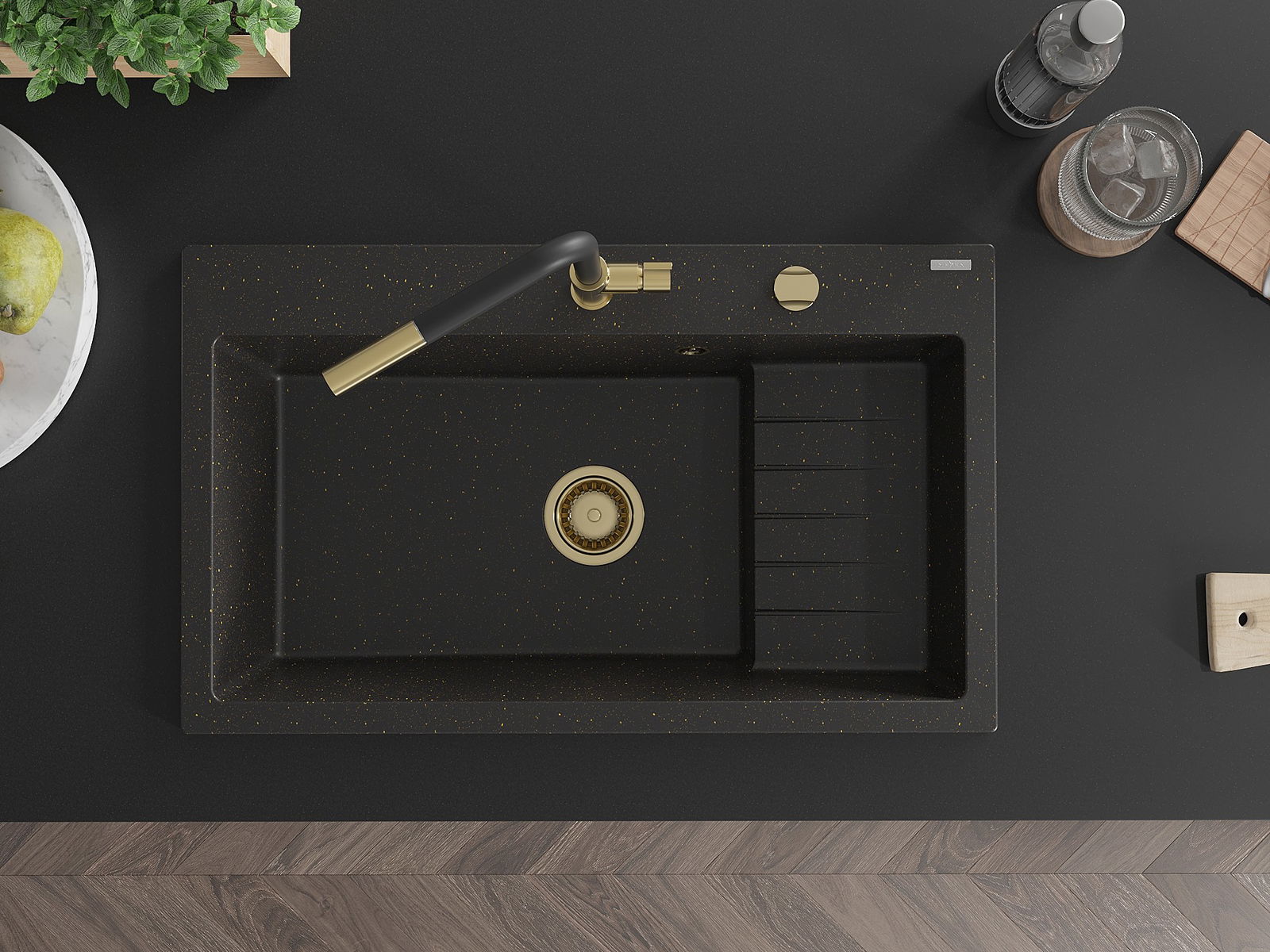 Mexen Omar 1 rekeszes gránit mosogató 800 x 480 mm, fekete/arany metál, arany szifonnal - 6520801005-75-G