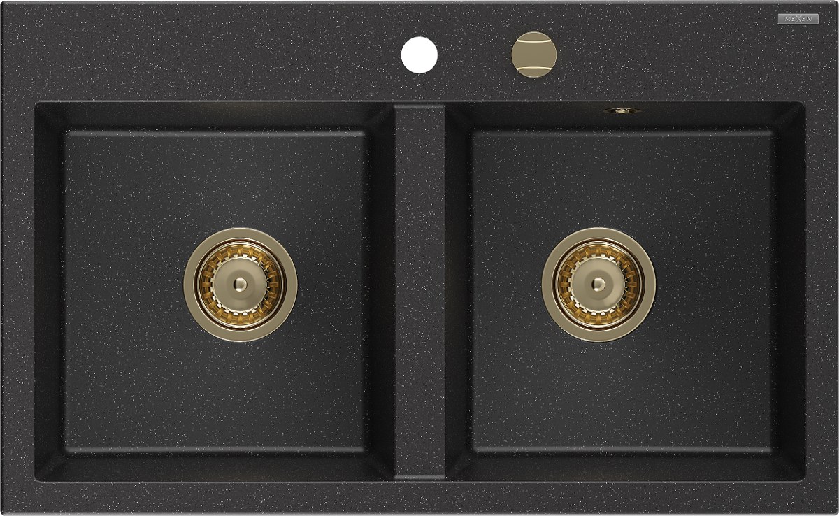 Mexen Hektor 2-kamrás gránit mosogató 800 x 480 mm, fekete/ezüst metál, arany szifon - 6521802000-73-G