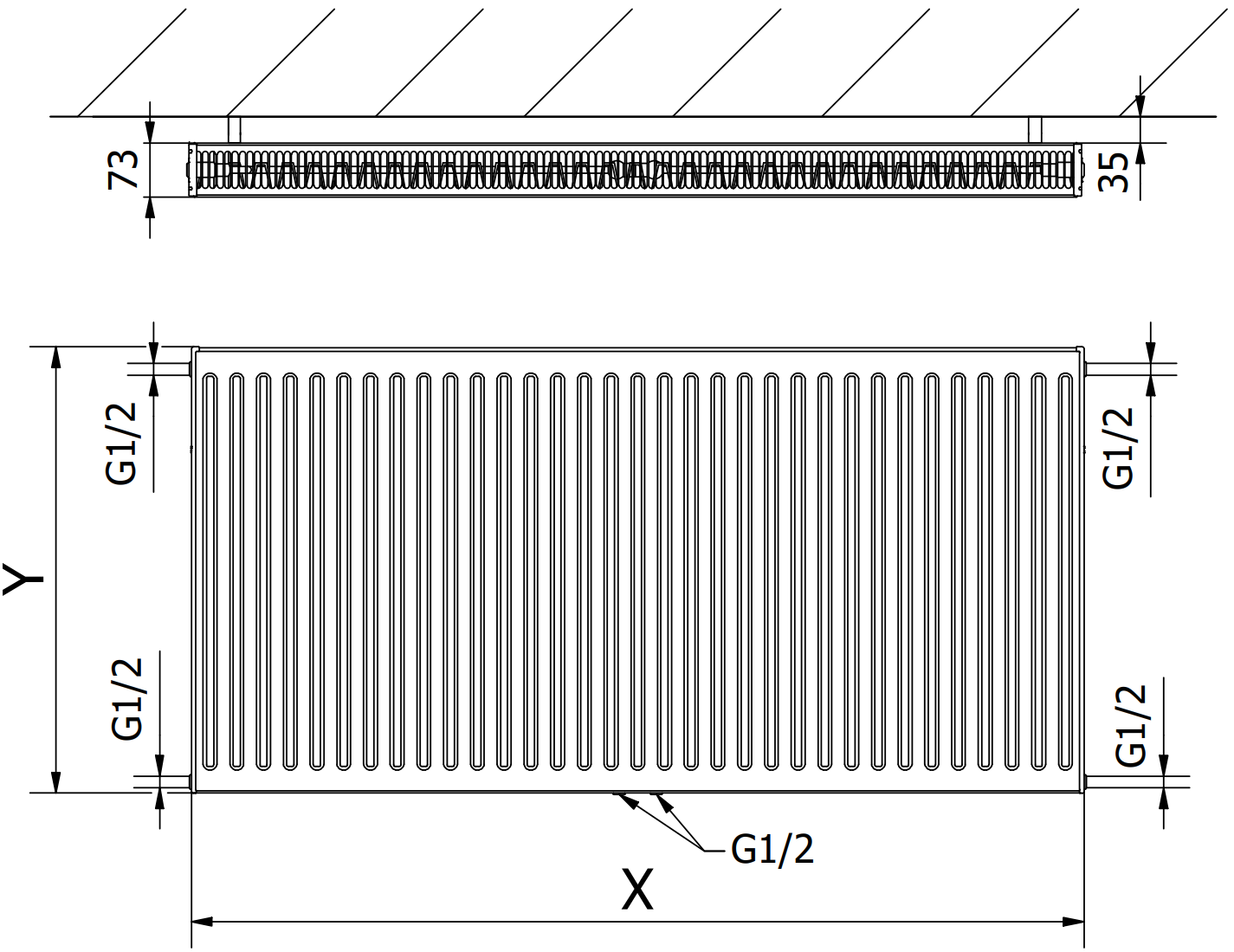A képek a 600 x 1200 mm méretű radiátort mutatják.