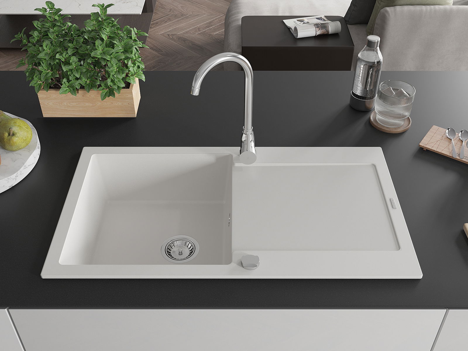 A mosogató kiváló minőségű gránitból készül. Ez egy elegáns és mindenekelőtt minden konyhához praktikus kiegészítés, stílusától függetlenül. A kiváló minőségű és a gránit tartósság biztosítja a sok éves használatát.