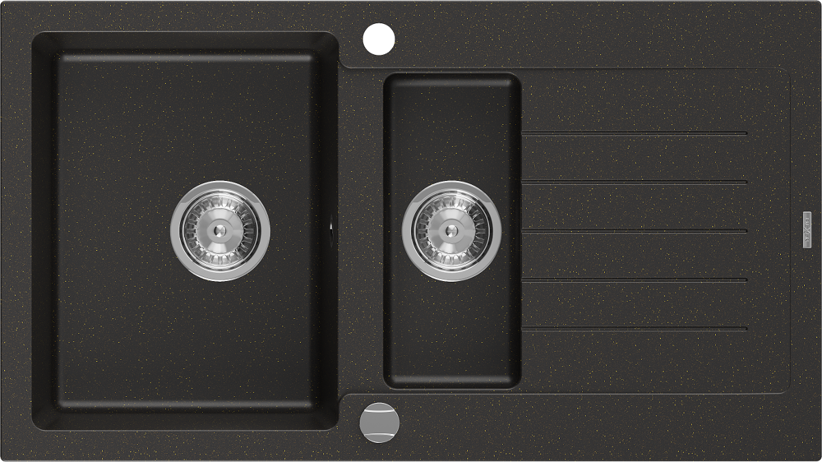 Mexen Matias gránit mosogató 1,5 rekeszes csepegtetővel 900 x 505 mm, fekete/arany metál, króm szifon - 6502901505-75