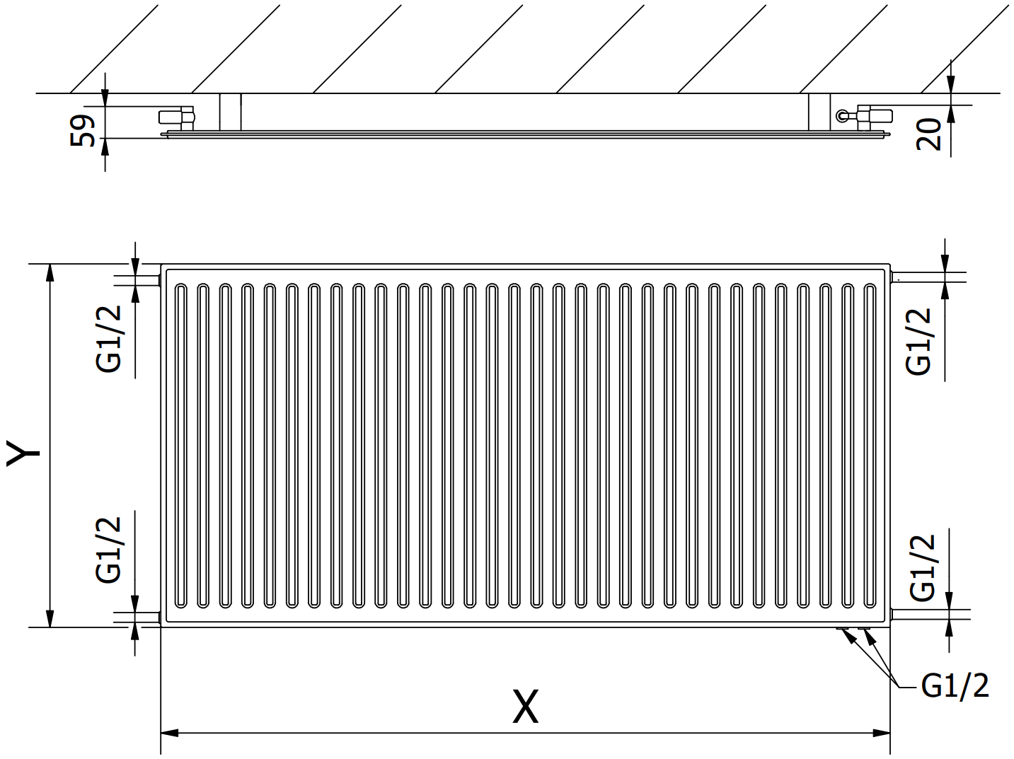 A képek a 600 x 1200 mm méretű radiátort ábrázolják.